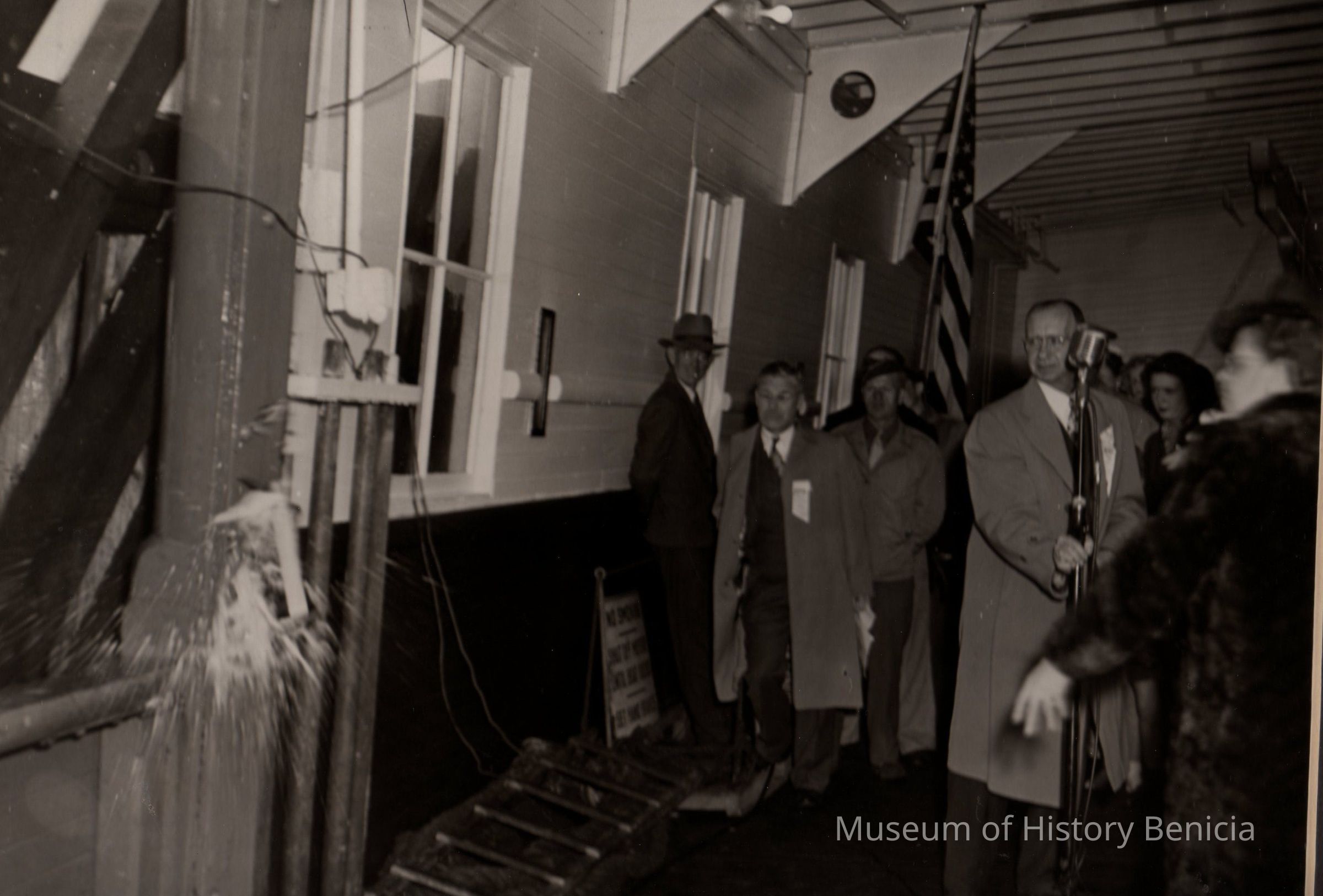 B/W photograph appears to be a christening of some type perhaps a ferry boat; woman at right has thrown a bottle which has burst against a wall at the right; a number of people are watching in the backgroundCollection