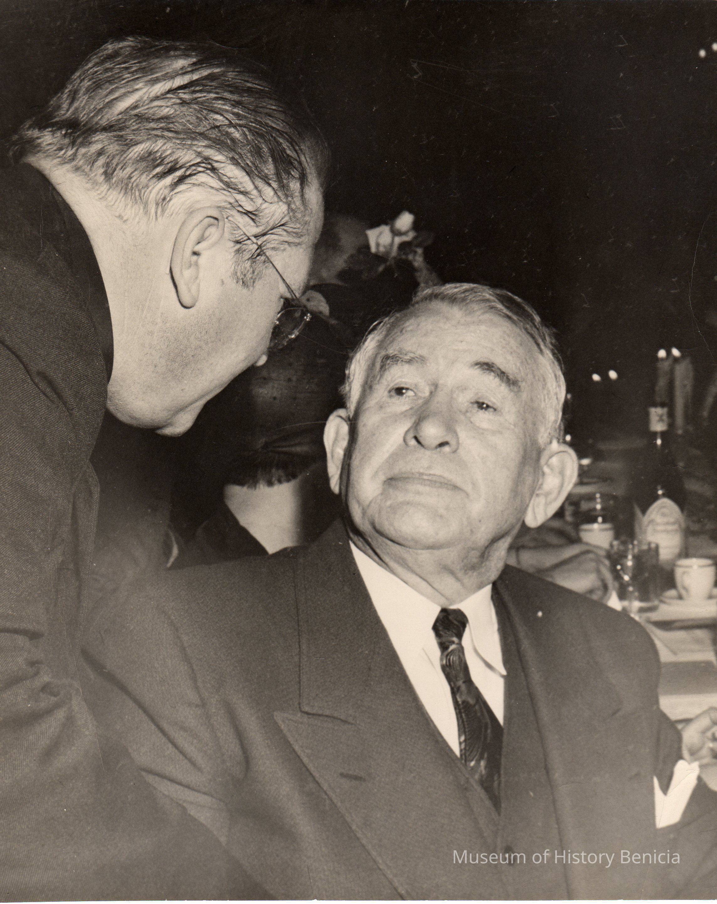 Man at left leans to man in suit and tie seated at table. "Father Sale & vice pres--Alben[?] Barkeley--" on back.