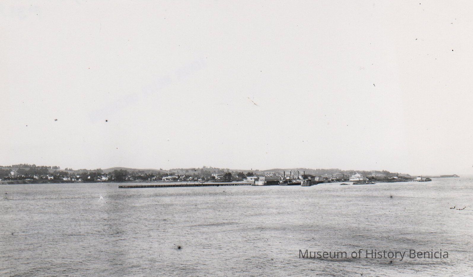 B/W photograph: Benicia waterfront taken from the straits, showing ferry docks.