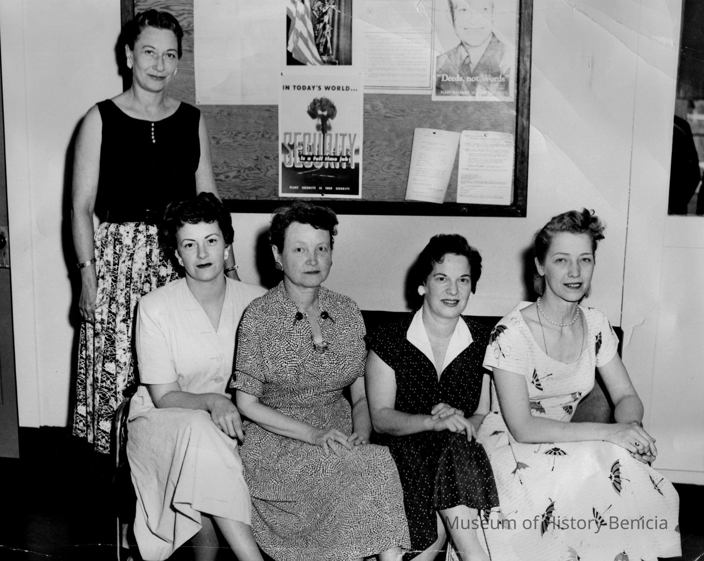 Staff of Benicia Arsenal Purchasing Department in 1950. L/R: Rosita Cobb, Contracting Officer; Shirley Irti, Contract Administrator; Virginia Terry, Contract Administrator; Helen ______, Expeditor; and Maxine Moore, Buyer. Purchasing Department was located in Building 47. Information written by Mrs. Irti on back of photo. B/W photograph.Collection