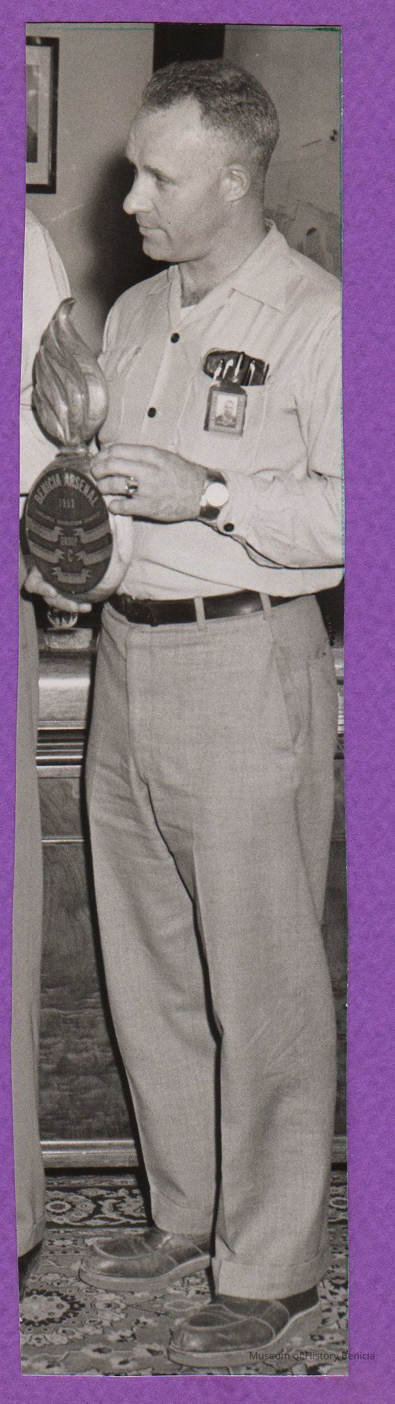 In this photograph he appears to be accepting an award or representing the Carpenter shop at a ceremony.Collection