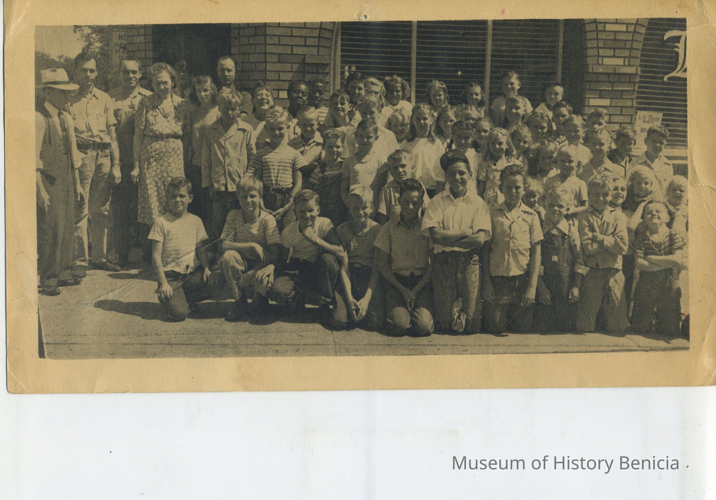 B/W photograph - taken around 1944; it is a group of boys and girls who sold newspapers for the local newspaper; it was taken in front of the newspaper office on First Street;