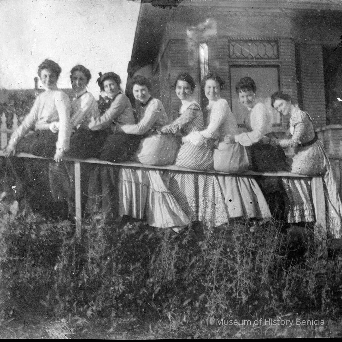 Photograph from album page, photo of eight women sitting on railing in a row, arms around each other. Caption "Party at Gerrishes".Collection
