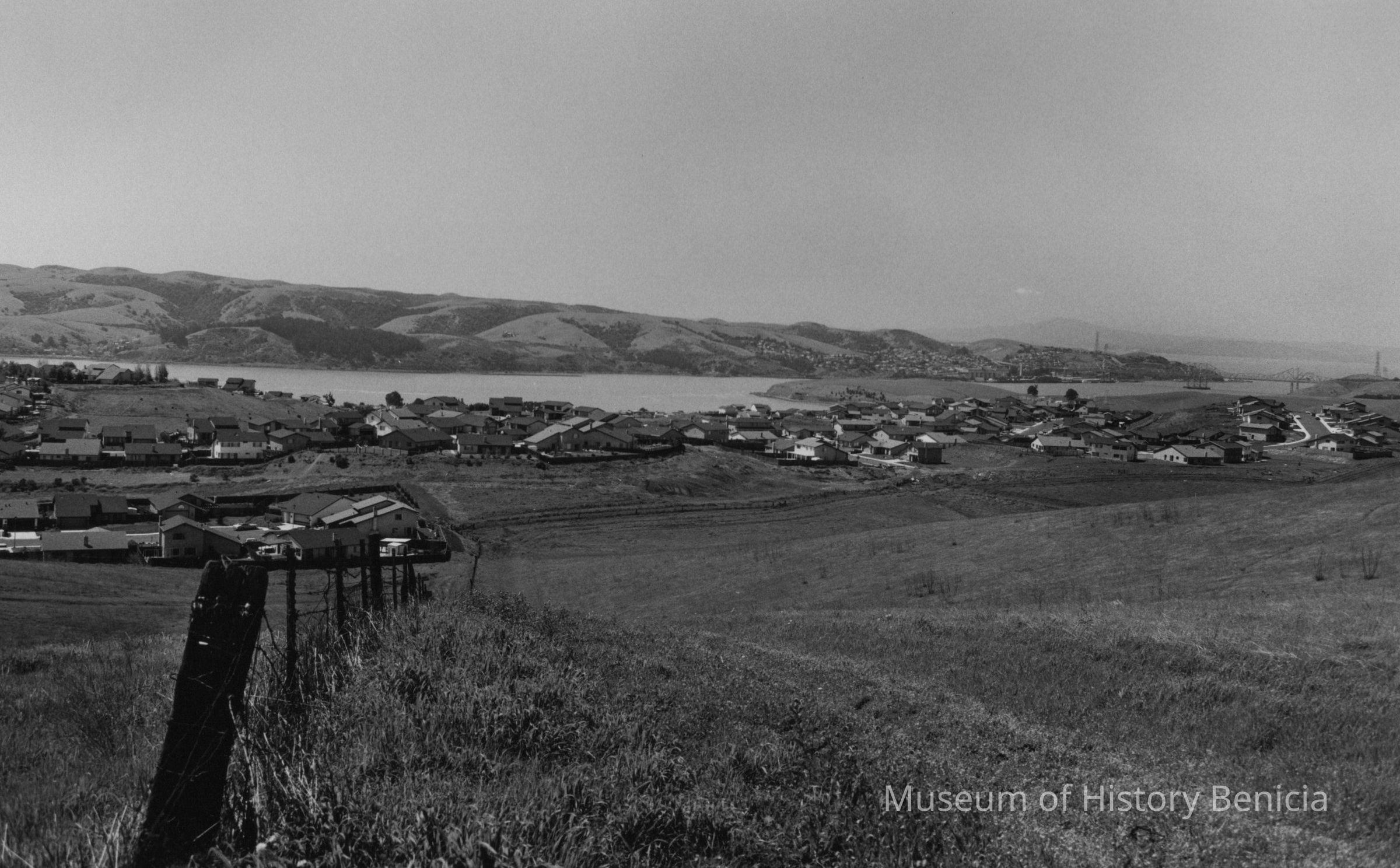 B/W photograph - Southampton development looking south toward the Carquinez Strait. Crockett is in right background. Mills Drive is at far right and Durham Court is the cul-de-sac in the left foreground.Collection