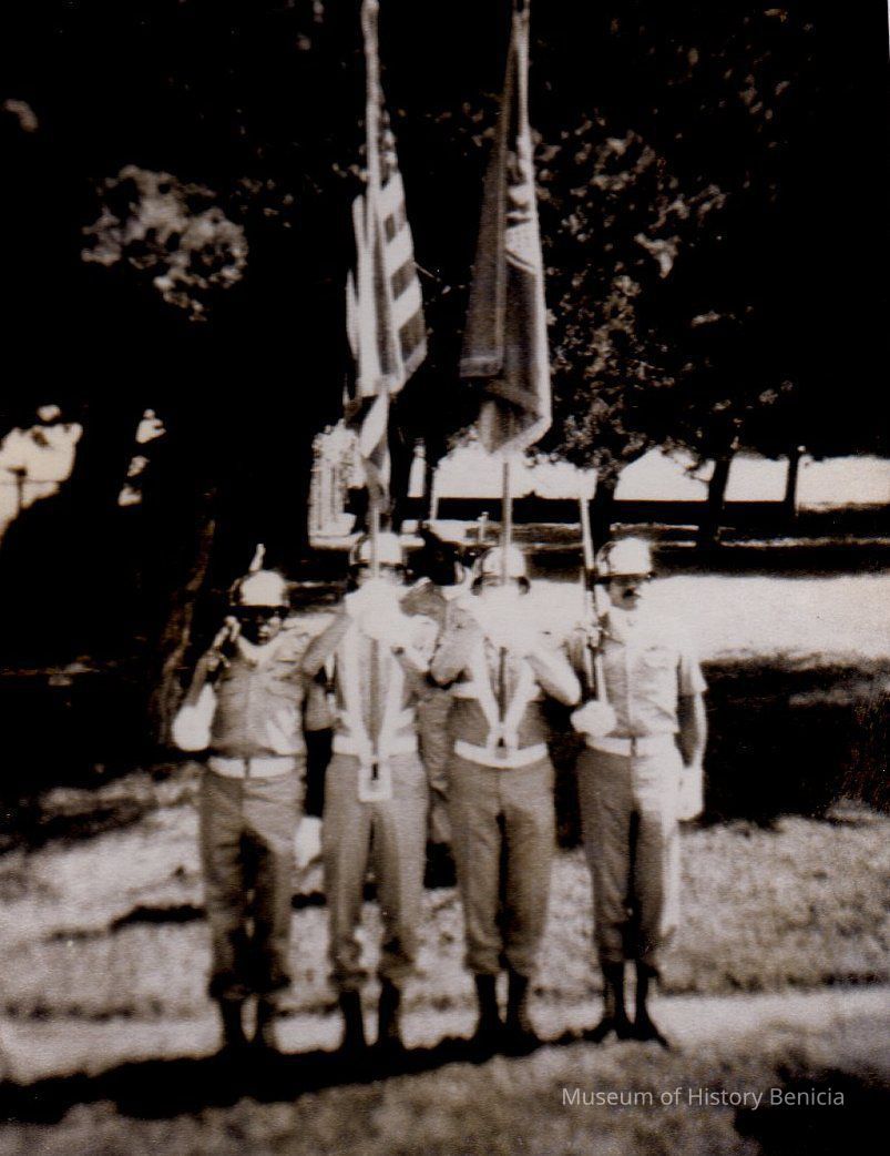 B/W photo of four men in military uniform, two with flags, two with guns. Label on back reads: "Memorial Day 1980 Benicia / L to R / SSG Joseph, SSG Zarling, SSG Fauver, SSG Means."Collection