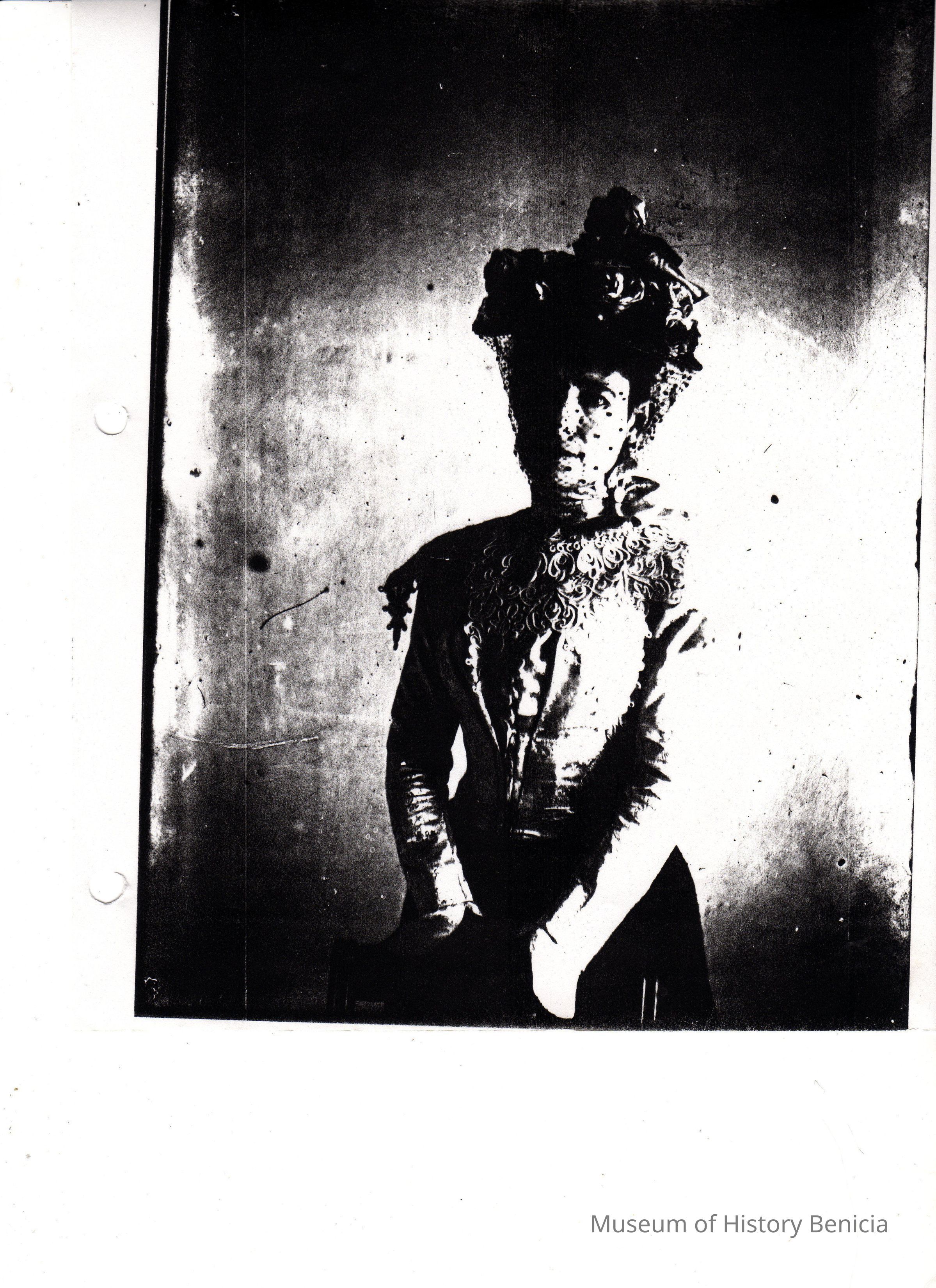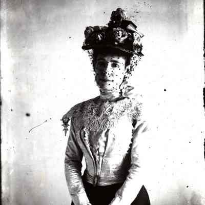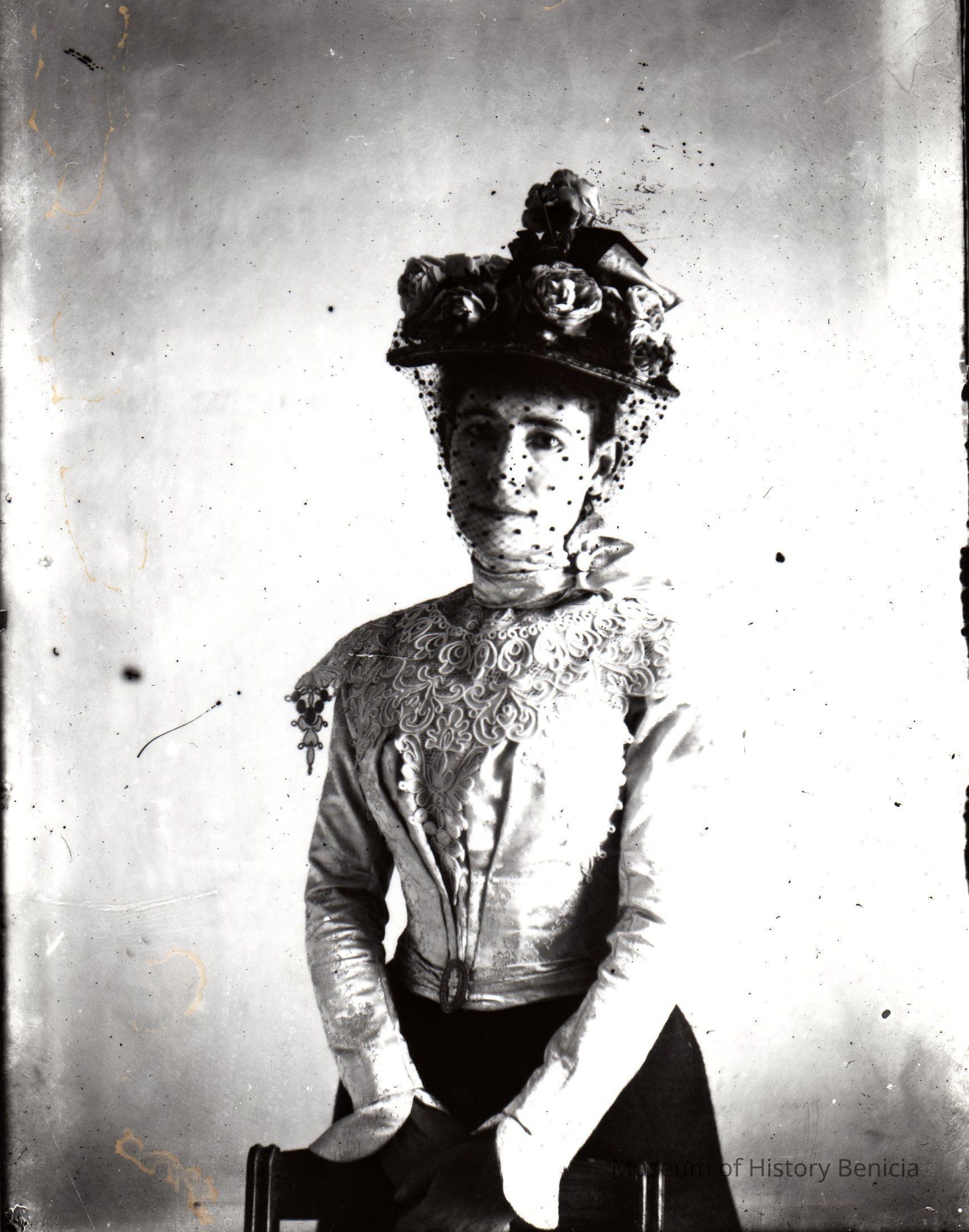 Glass plate negative and black and white print of an older lady, Henrietta Fish, with a veil.