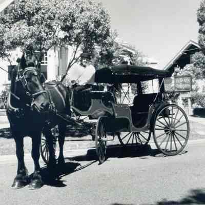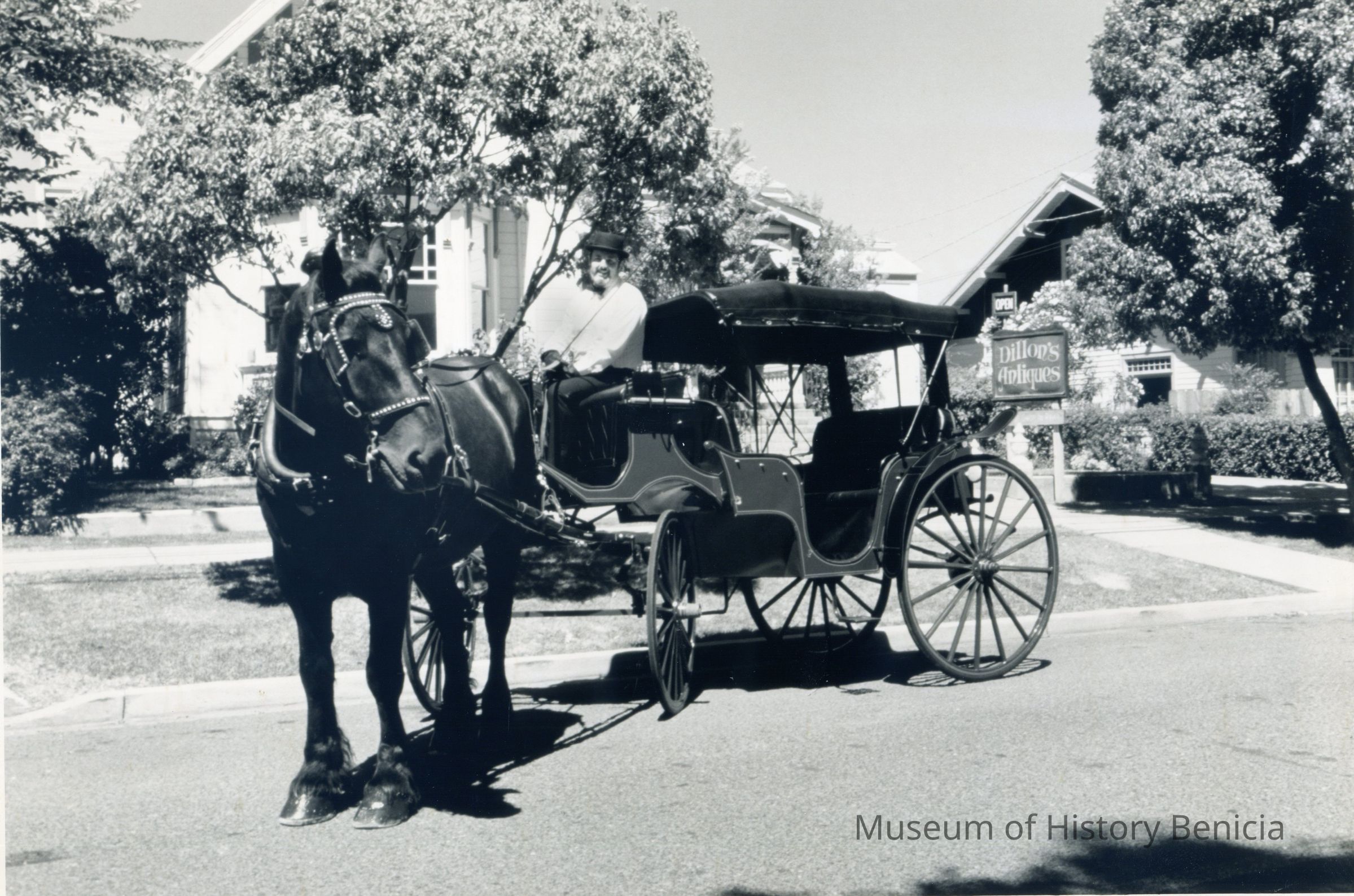 B/W A man driving a horse-drawn carriage. He is in front of Dillon's Antiques.