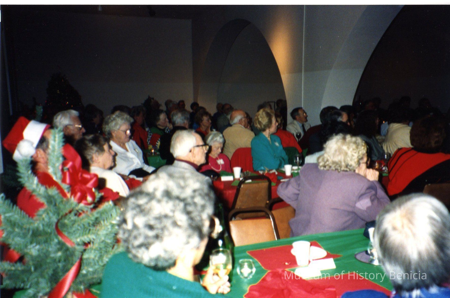 Color photo of the audience sitting at tables at the Camel Barn Christmas party 1991.
