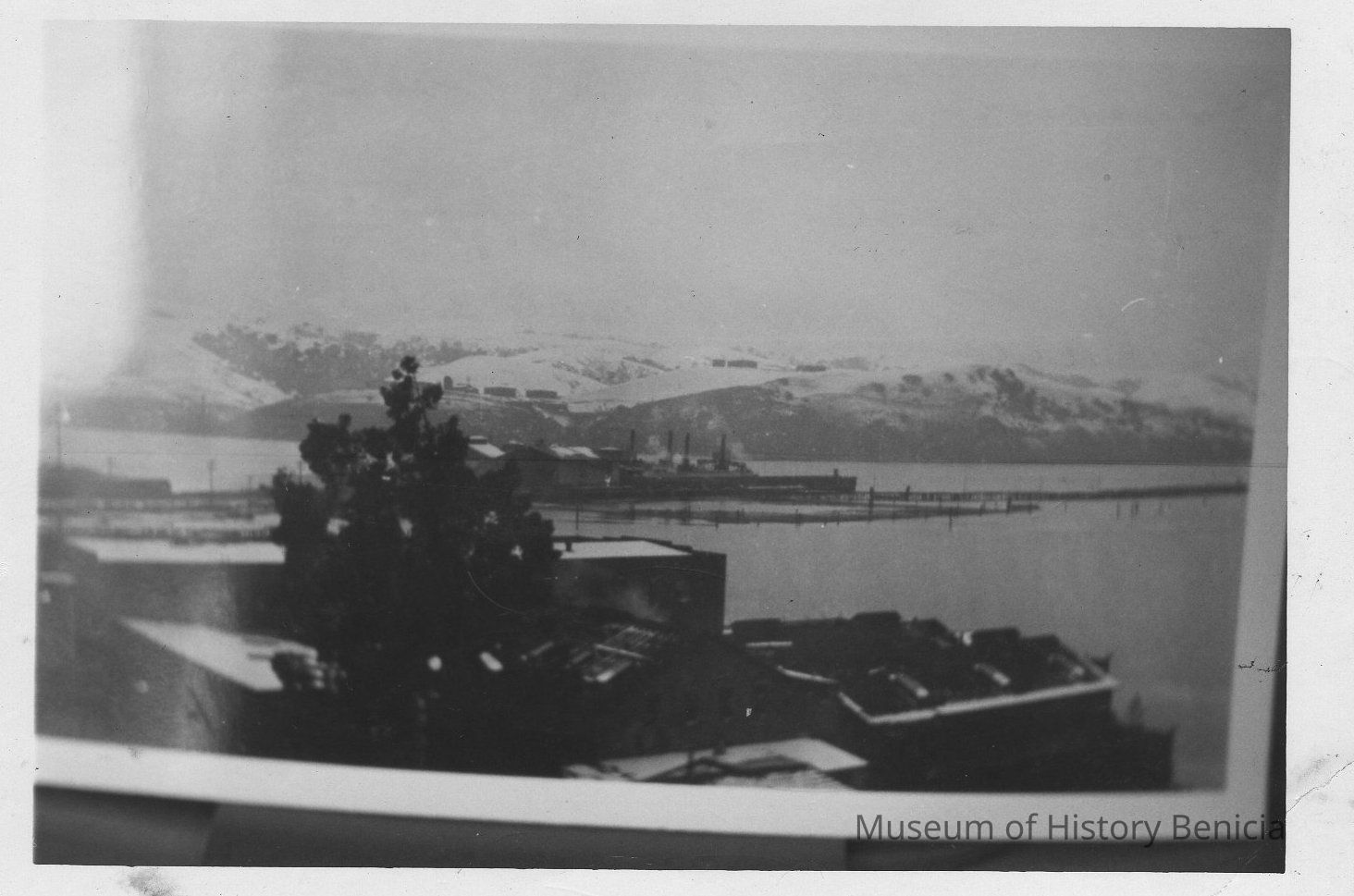 B/W photograph of a photograph: showing scene of snowfall in Benicia. Label indicates a date of 1920 or 1922.