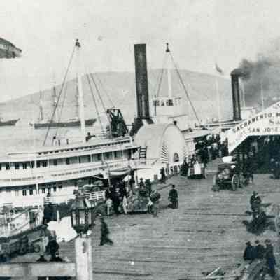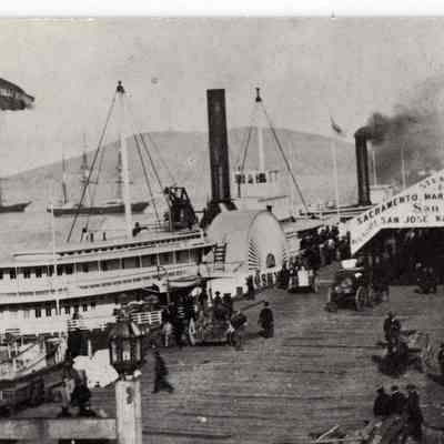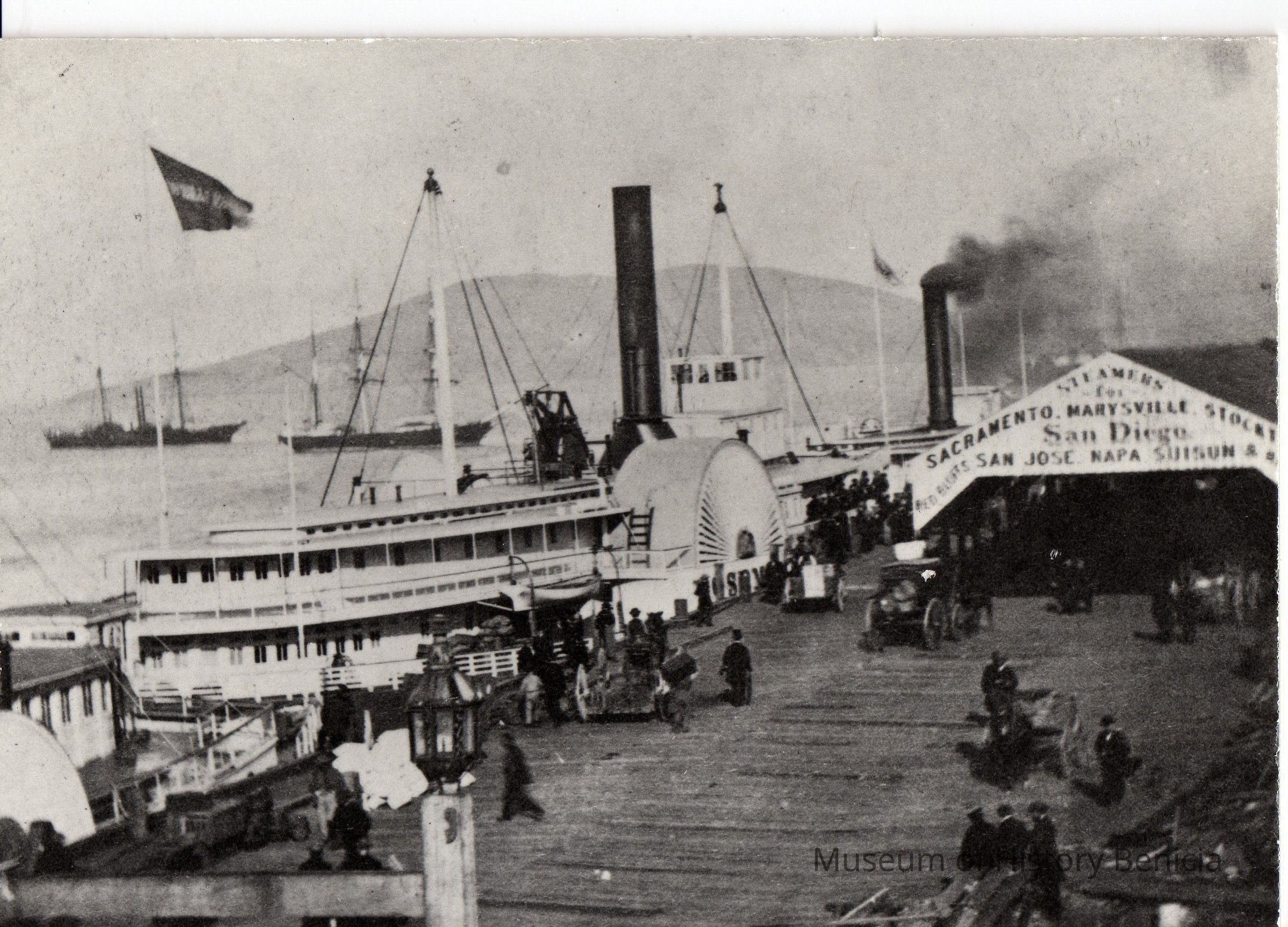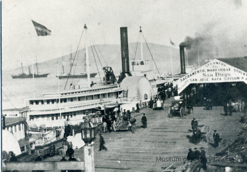 The Broadway Wharf, San Francisco, 1865, with the steamer "Yosemite". She and others like her sailed the inland waters for points north and east. Benicia was one of their stopping points. Note the right side of the sign.Collection