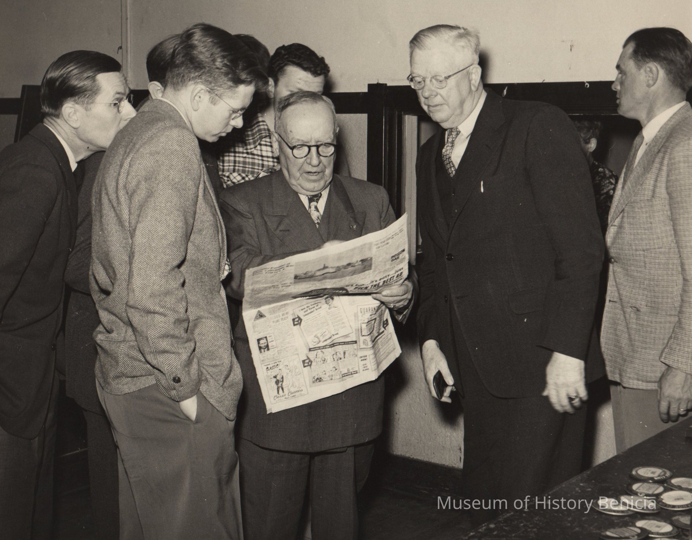B/W Photograph: per back of photograph: Port Captain A.C. Woodress explains a newspaper story on the Benicia-Martinez ferry system. Left: William Martin; Right: LeRoy Beede.Collection