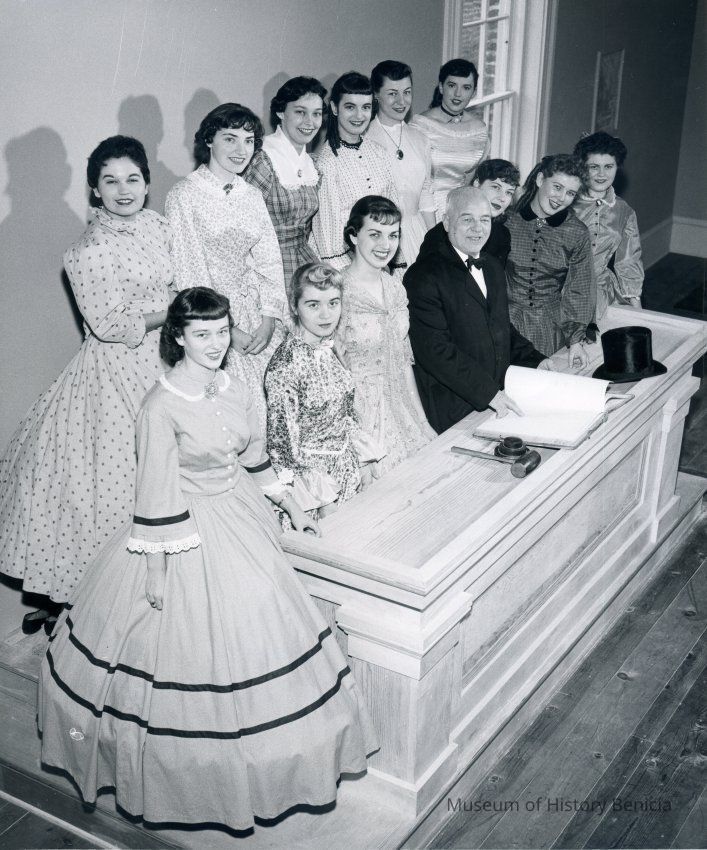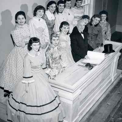 B/w photograph of 12 young women and one man dressed in 19th century clothing, posed behind a podium. The Lenoir Miller Collection. Back Row: Betty Lou Lewis, Sharon Harty, Carol Pressley, Virginia Saitz, Joan Passalacqua (perhaps), Norma Sharon. Front Row: Mary Prudhome, unknown, Louella Higginson, Frank Passalacqua, Martha Miller, Karen Wold, Delma Pinkham. They are in the old capitol building.Collection