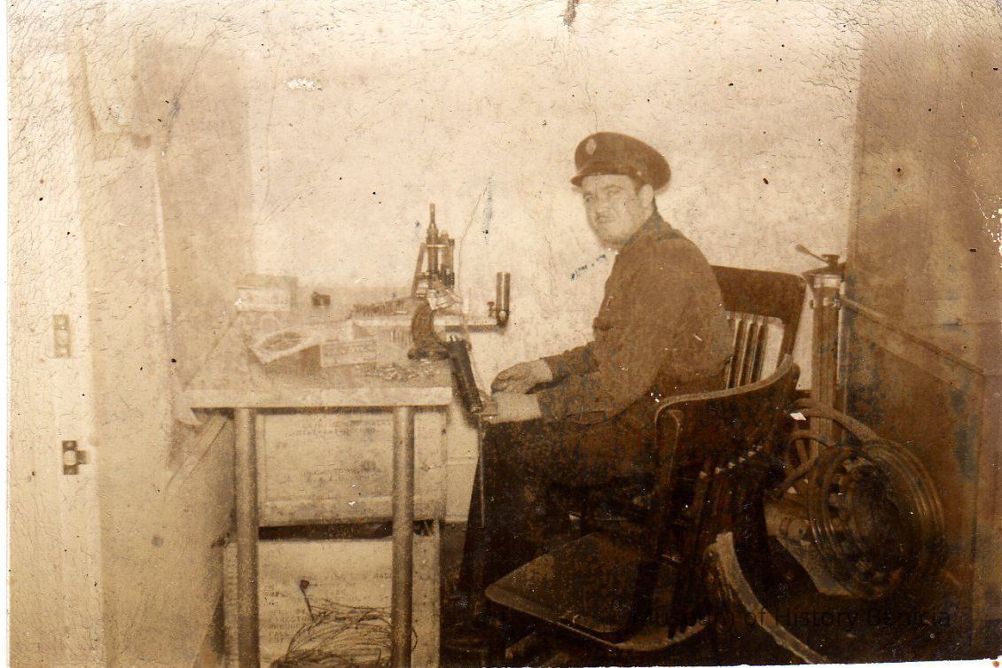 B/W photograph of a fireman in a "small" office (hose on reel behind him) identified on back as Jose Silva Benicia Police/Fire