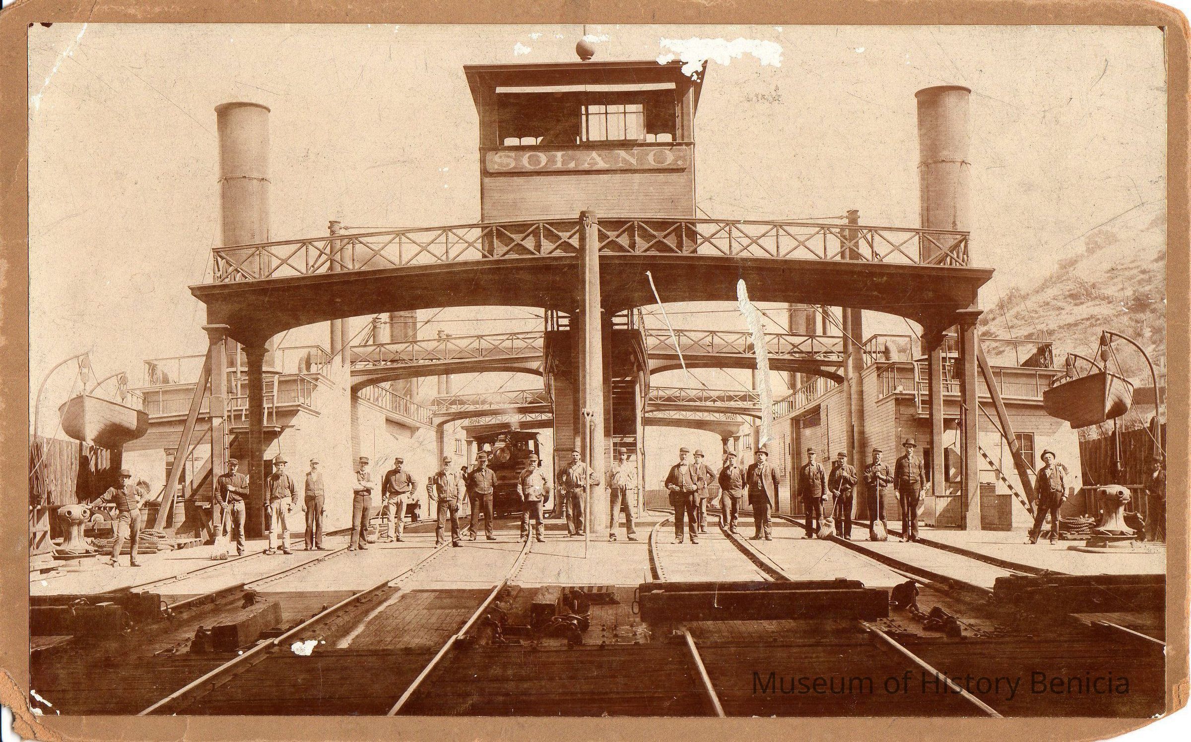 B/W Photograph: Ferry "Solano" running from Benicia to Port Costa carrying trains. Twenty men are shown on the deck, most of them workers on the ferry.