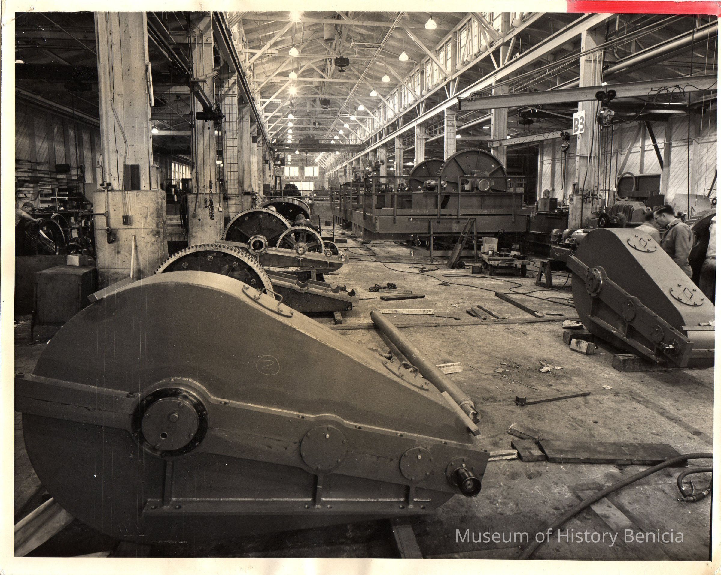 Emergency gate hoists and tainter gate hoists, Barkley Dam, Gust. K. Newberg Const. Co. Photo taken of equipment in shop. Black and white photo.Collection