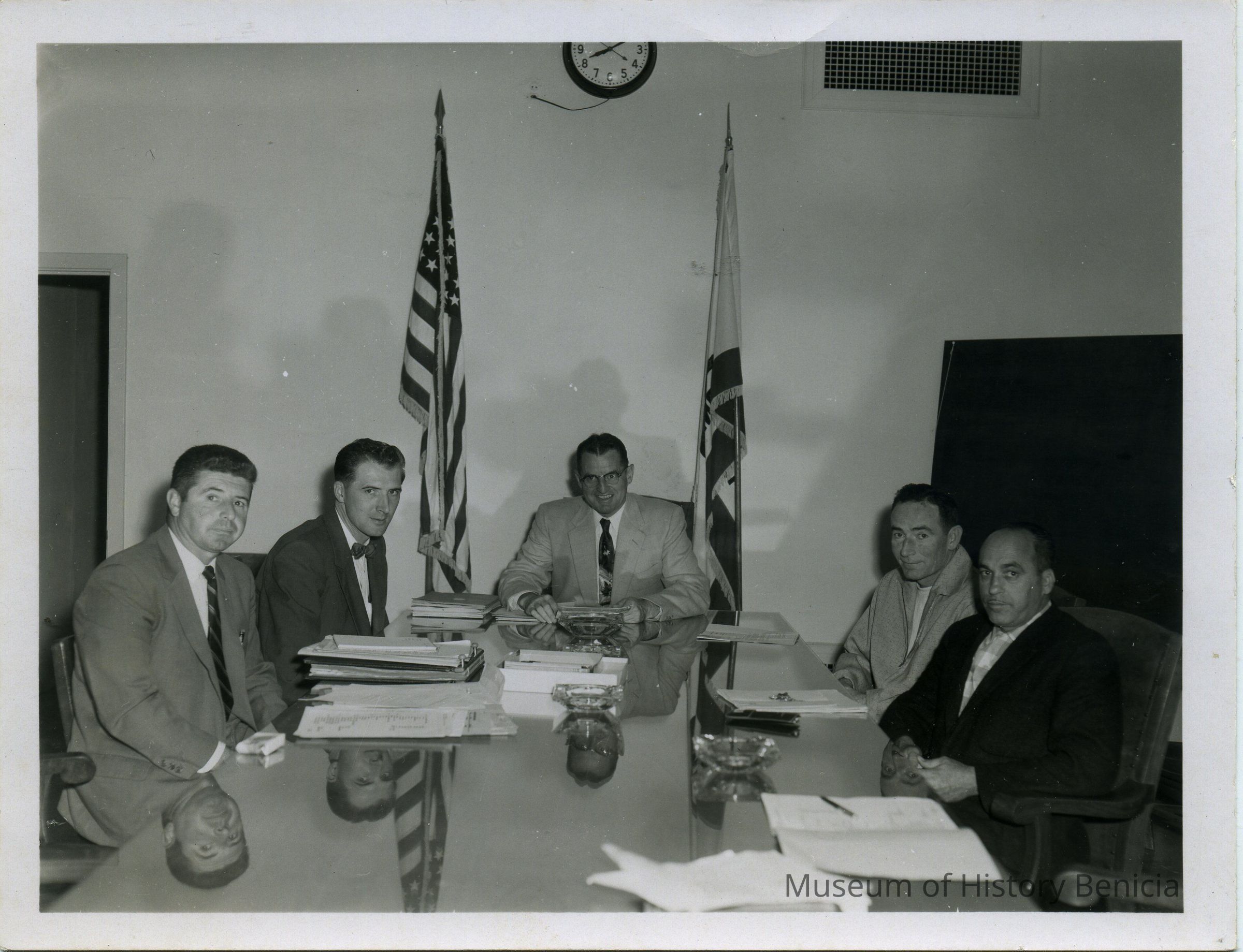 Black and white photo of five men seated around table in room with flags (identified as 1956 city council). L/R: Ray Duval, ____ Cabel, Ed Koenig, ________, Jim Lemos. "Lenoir Miller Collection" stamped on back.Collection