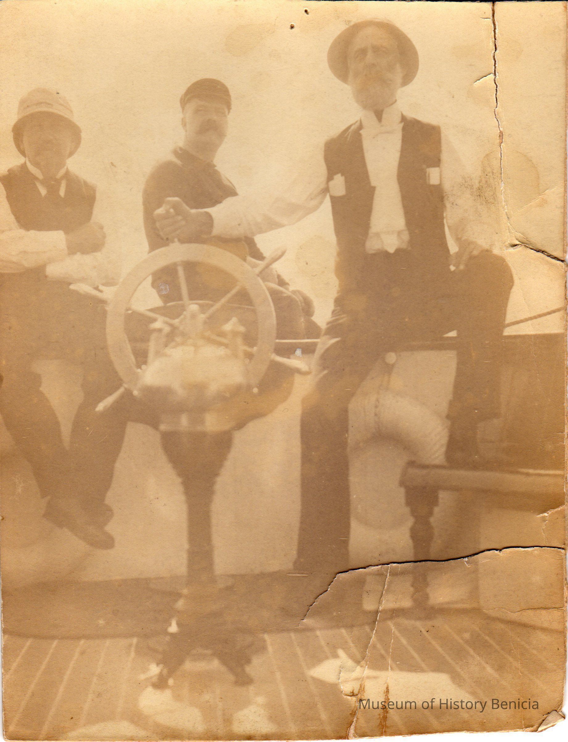 Sepia toned photograph of three men on a ship. The man on the right is holding the wheel of the ship. He may be Horatio Turner, Matthew Turner's brother.Collection