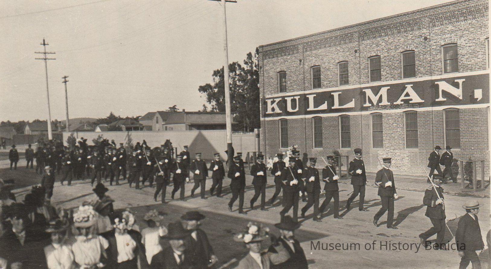 B/W Photograph: early day parade on First Street near the Kullman Salz Tannery