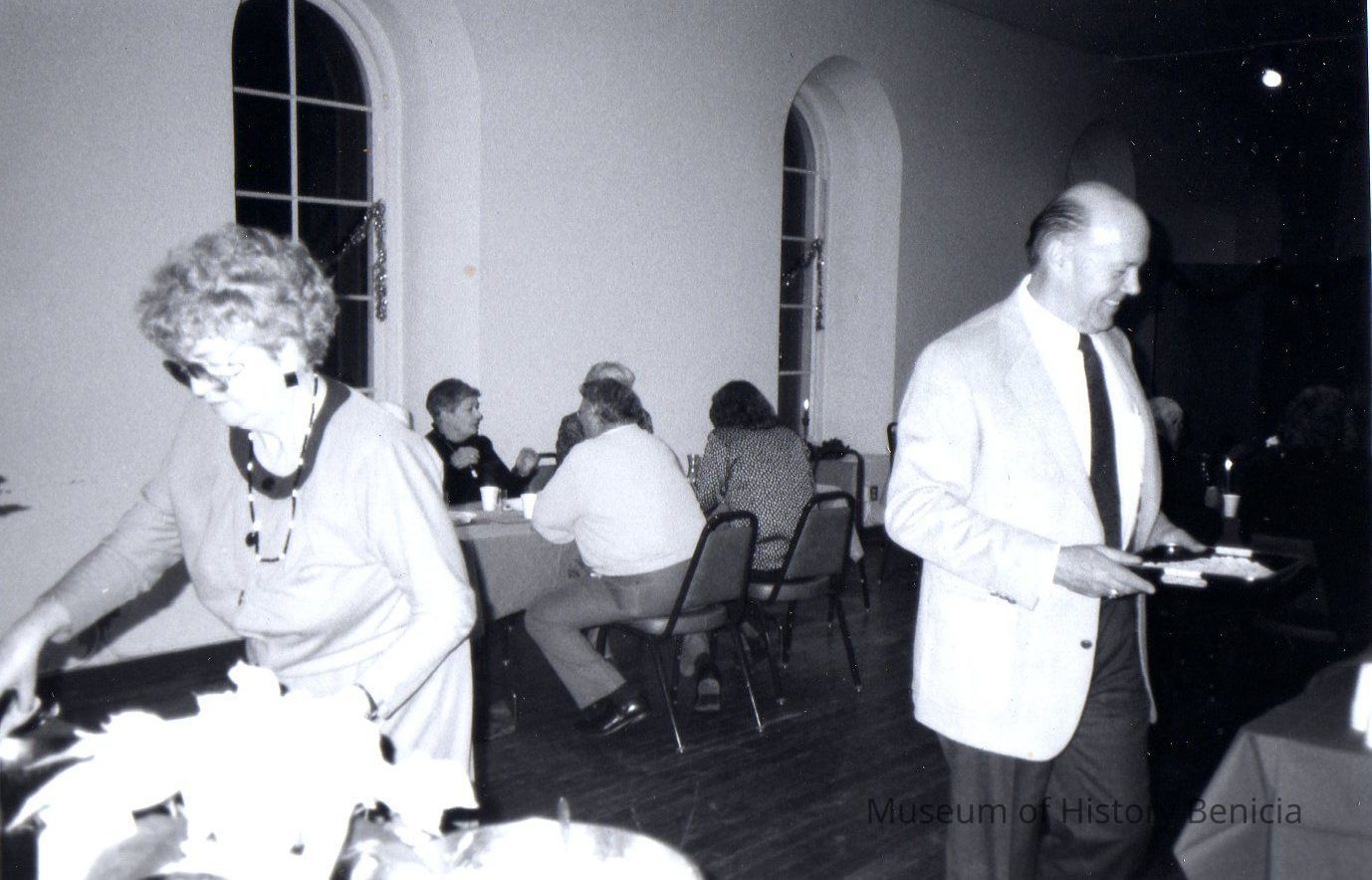 B/W photo of Camel Barn Museum Christmas Party, 1986. Two people standing near refreshment table, Tom Bowles at right and unidentified woman at left. People are seen at the rear sitting at tables.