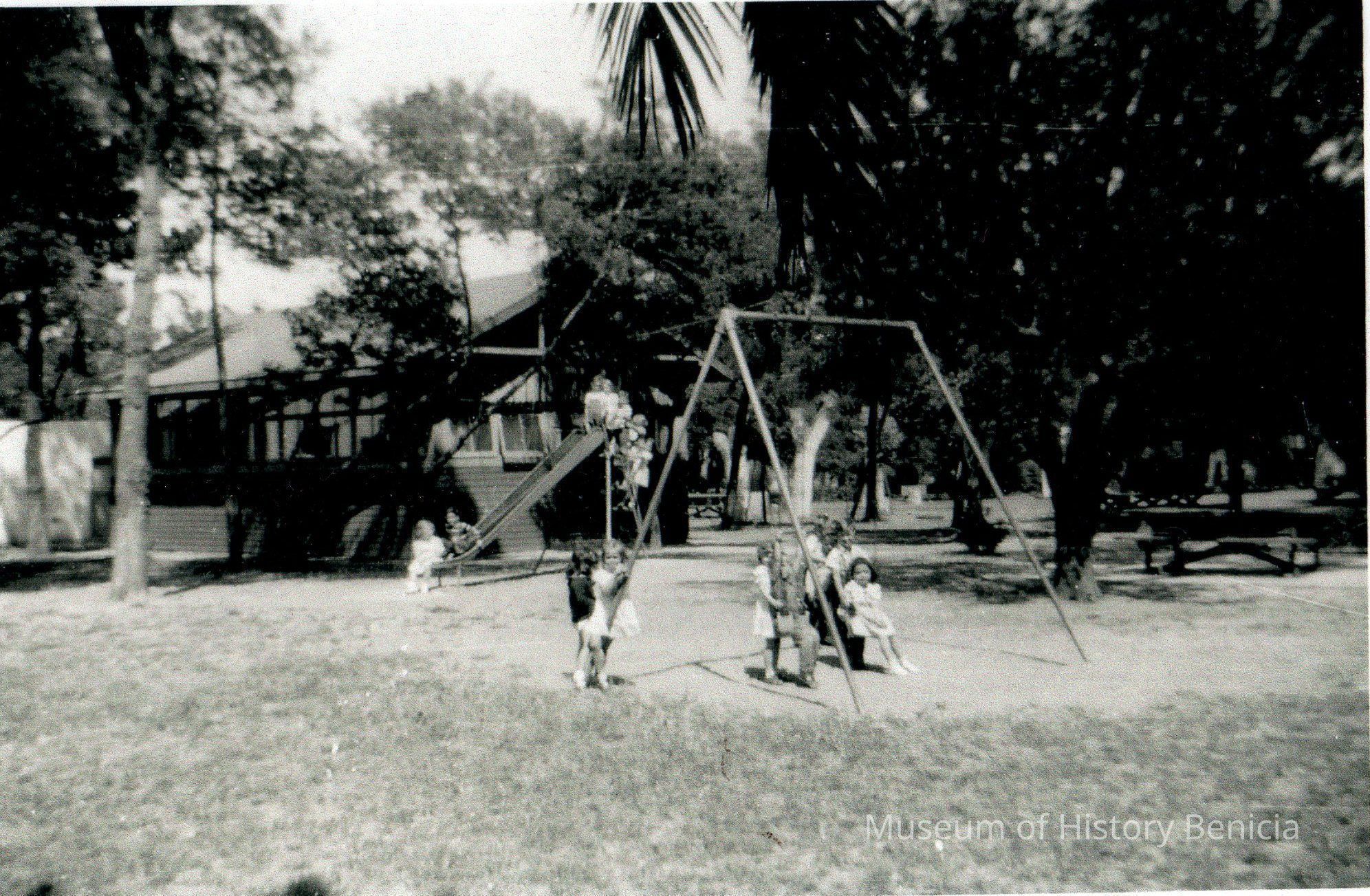 B/W Photograph: the kindergarten in the park building is shown in the late 1940's or early 1950's with children on play equipment in the foreground. The children are unidentified.Collection
