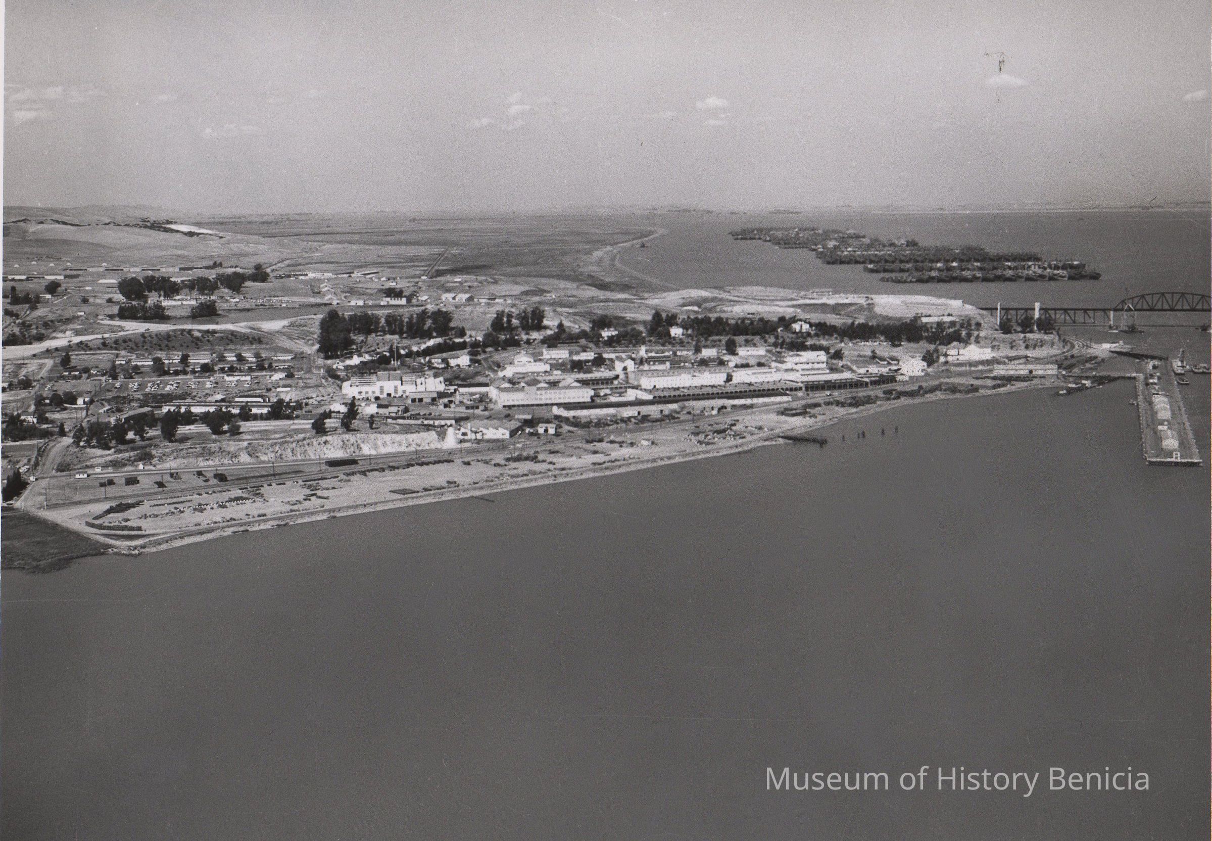 B/W Photograph: Aerial view of Benicia Arsenal just before the time of its closing; it is prior to the building of the Humble Oil Refinery; and the Benicia Bridge had not yet been buillt.Collection