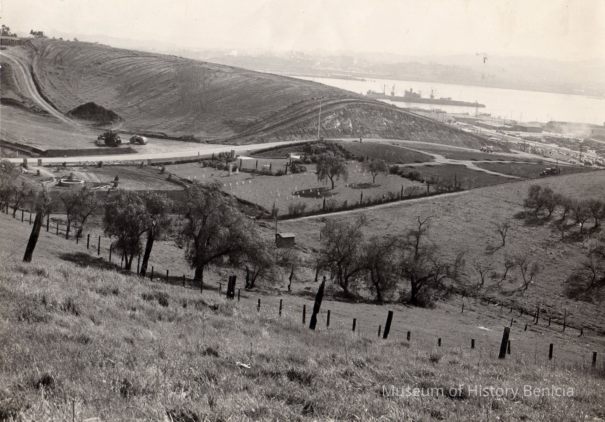 North, central and south areas of cemetery with a view of Benicia Arsenal Port in the background. B/W photo.