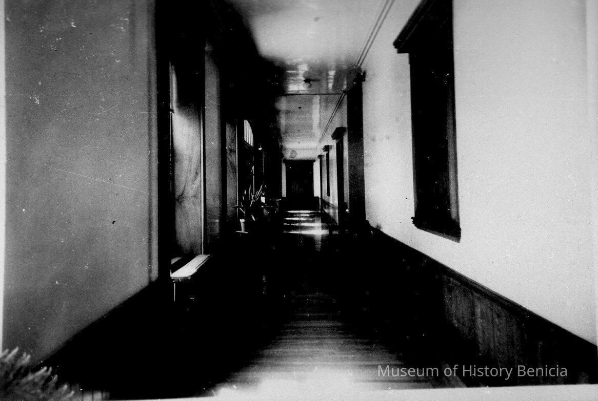 B/W photograph of a hallway in the nun's residence at St. Catherine's Academy. The photograph was taken just before demolition of the Academy.Collection