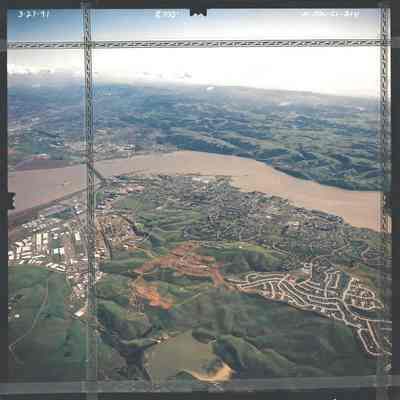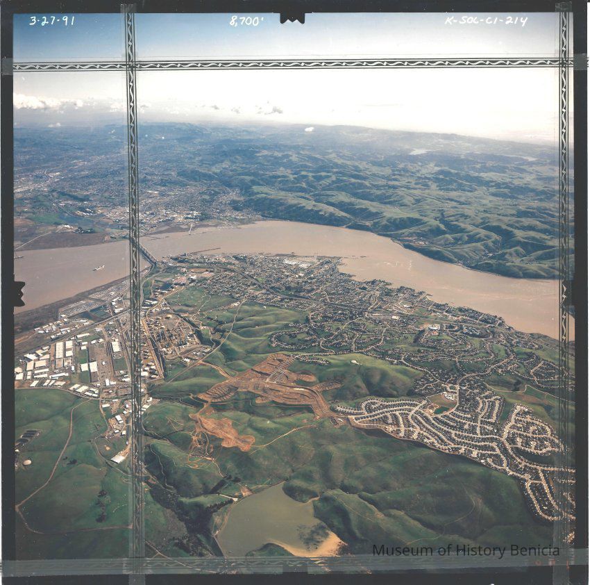 Color aerial photo of Benicia and Industrial park looking southeast from 8,700 Ft. has plastic tape boards placed on picture.
