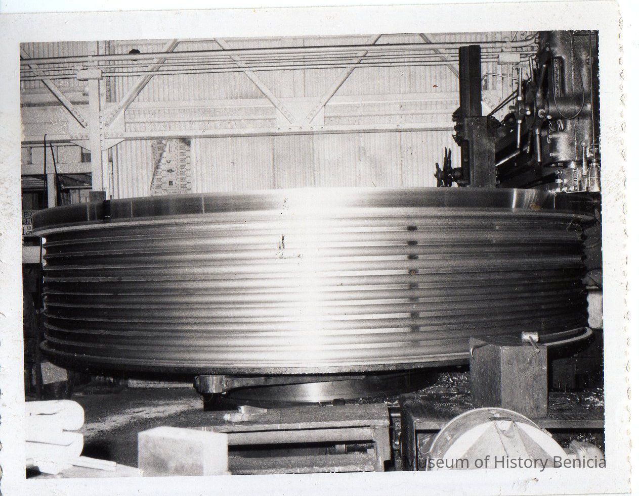 B/W photo of shiv being made at Yuba Co. in milling machine for Ohio River Bridge.