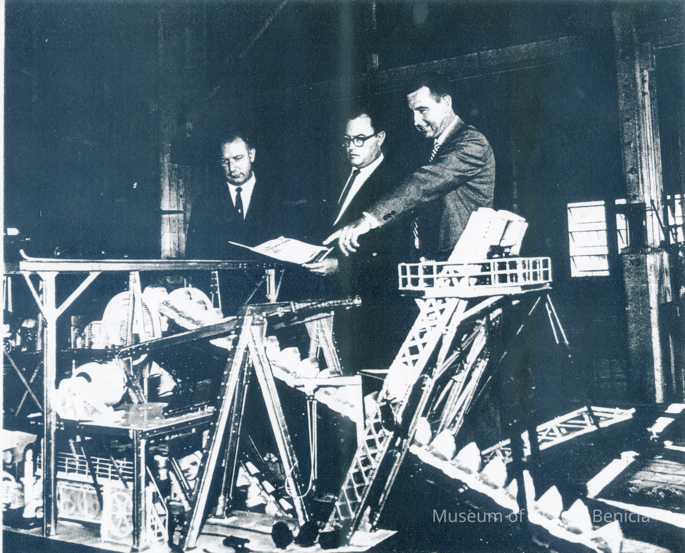 Model of a gold dredge at Yuba plant, Benicia. Leon Bates, center. Note: This is a different model than the 1913 one. Black and white photo.Collection
