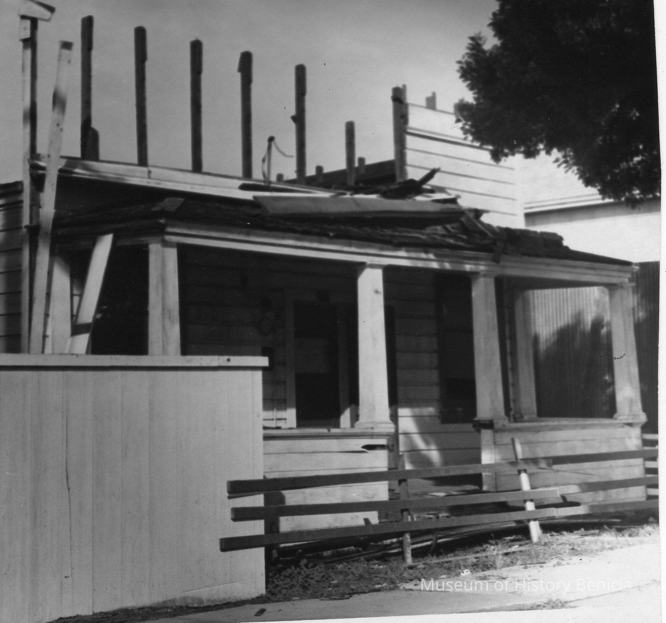 B/W photograph of a house in bad physical condition. On the back is written: "S.C. Grey house on East G Street. across street from Charles Clyne big white house. S.C. Grey came to Benicia in 1849. He was a merchant on First Street among the first. The house on East G Street was taken down in the late 1950s by Clifford Crowder. "Collection