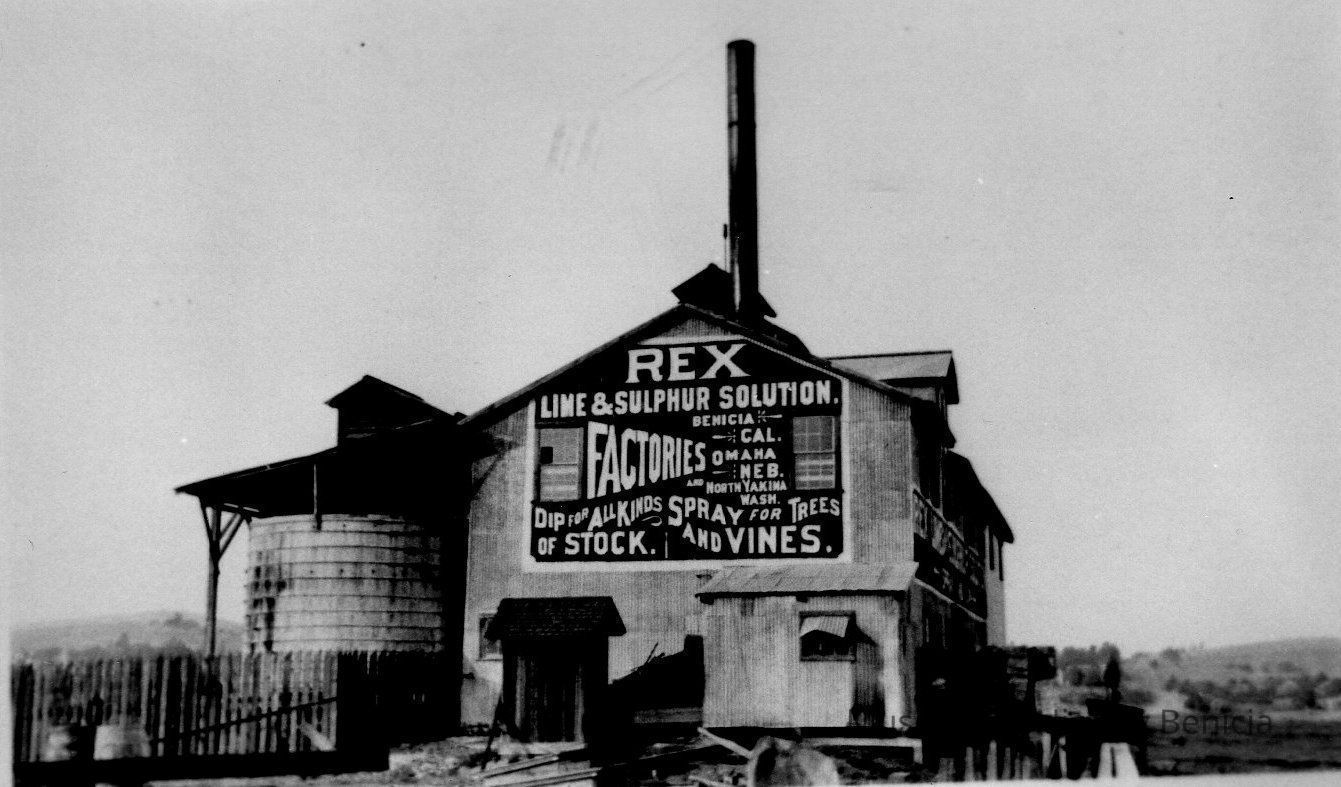 B/W Photograph: California Rex Spray Co. buildings located at the water's end of East Second Street (today the Marina area). (see also 2000.100.0036) (Attached is a newspaper clipping from the Benicia Herald at the time the Rex Spray Co. started in Benicia.)Collection
