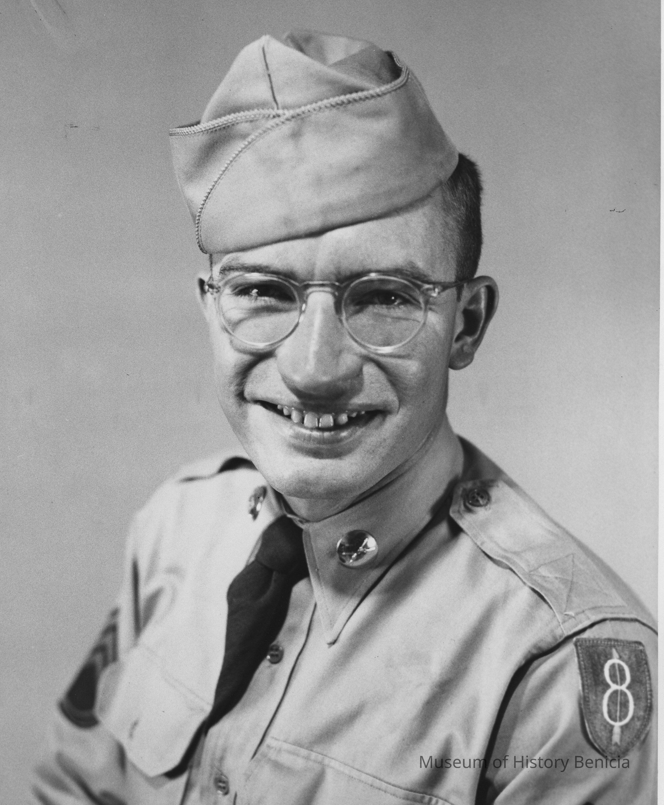 B/W Photograph: Bust view of young man in uniform shirt and cap, with dark hair and eyes and eyeglasses. U.S. Army Photo stamp on back. "S/ Sgt. Lee Rogers" in pencil on back.Collection