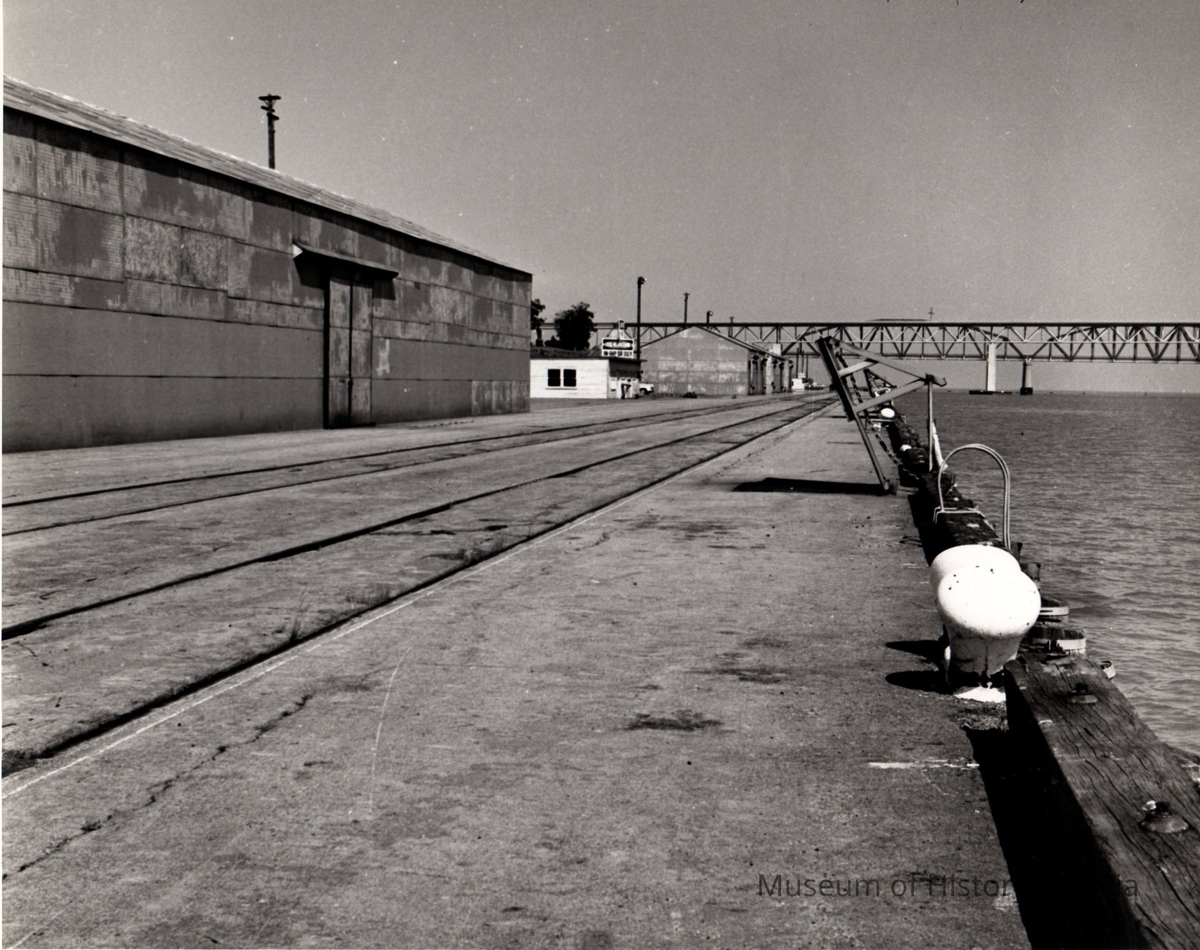 B/W photograph: view along dock, looking toward Benicia Bridge.