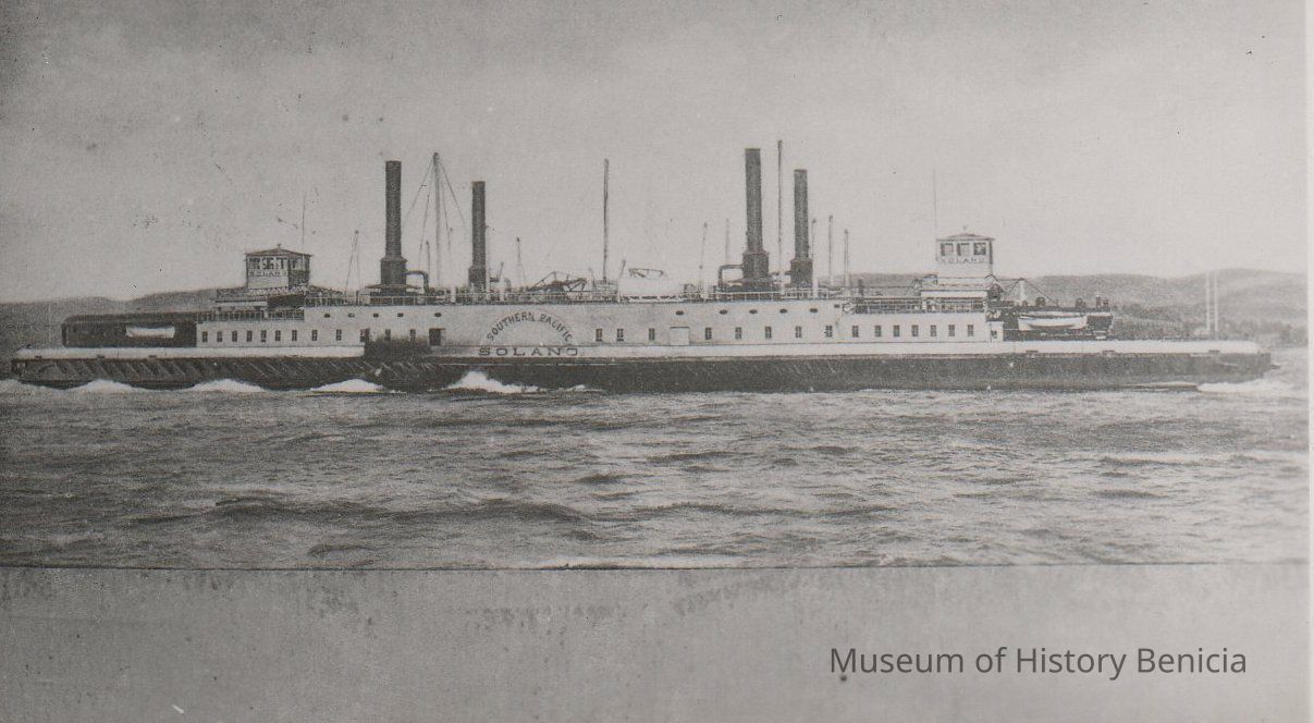 B/W Photograph of a Photograph: shows side view of ferry "Solano" with trains on it as it is crossing from Port Costa to Benicia.