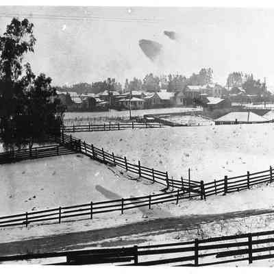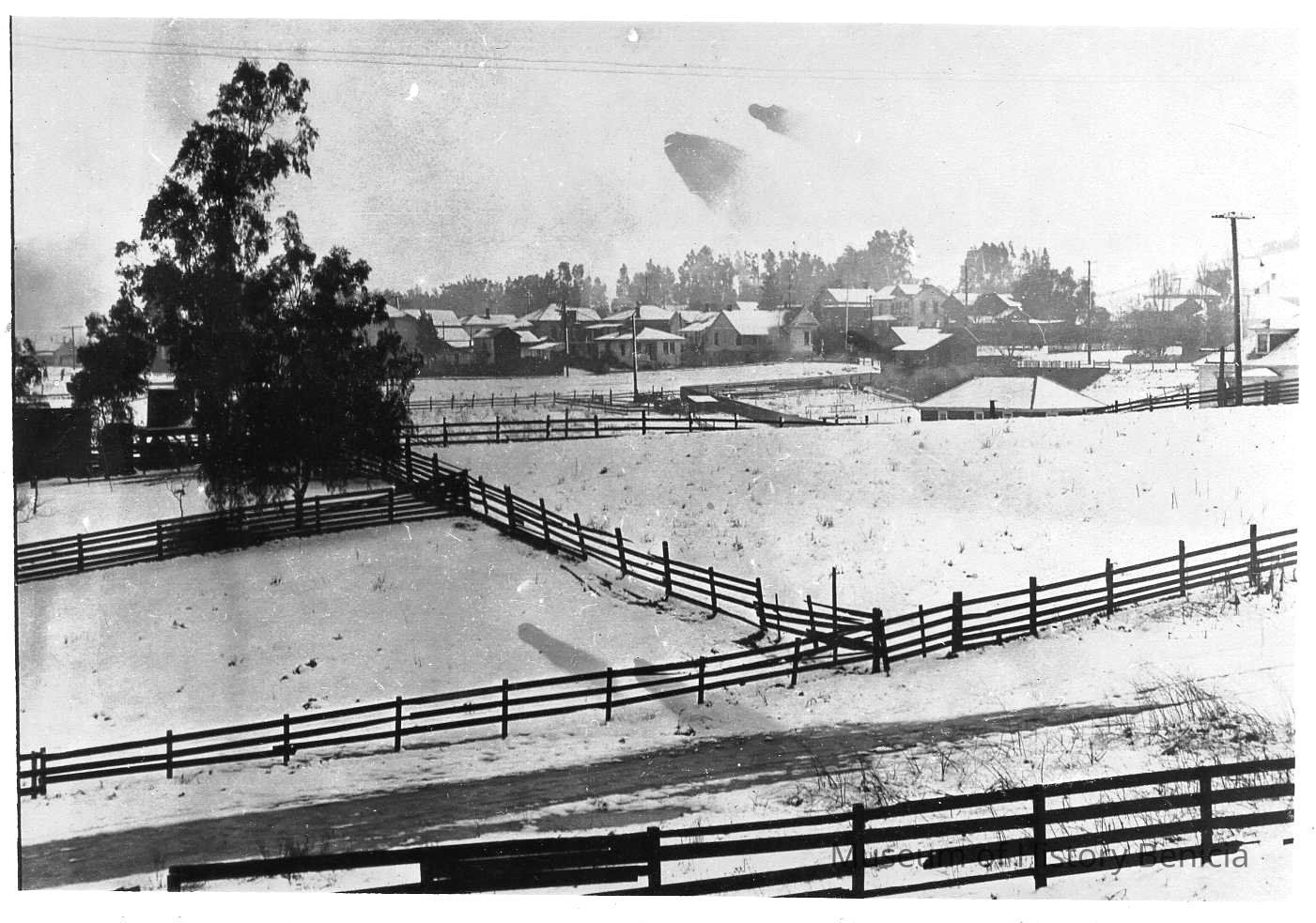 Photo of fenced fields and houses in the background. The ground is covered in snow. Could be Benicia.