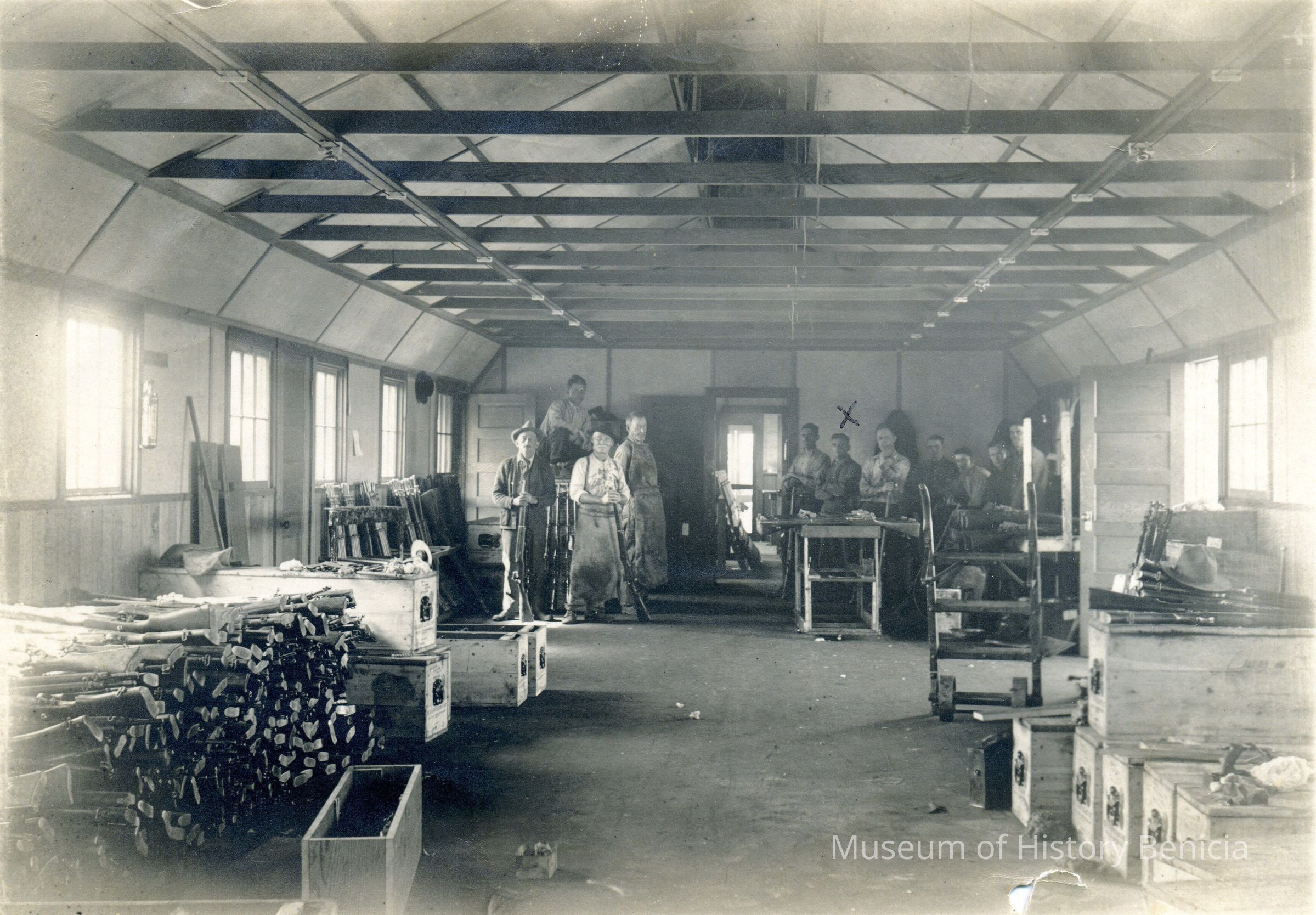 B/W Men in a workshop at the Benicia Arsenal. Man with an "x" over his head is Harold LaMay (John LaMay's father).