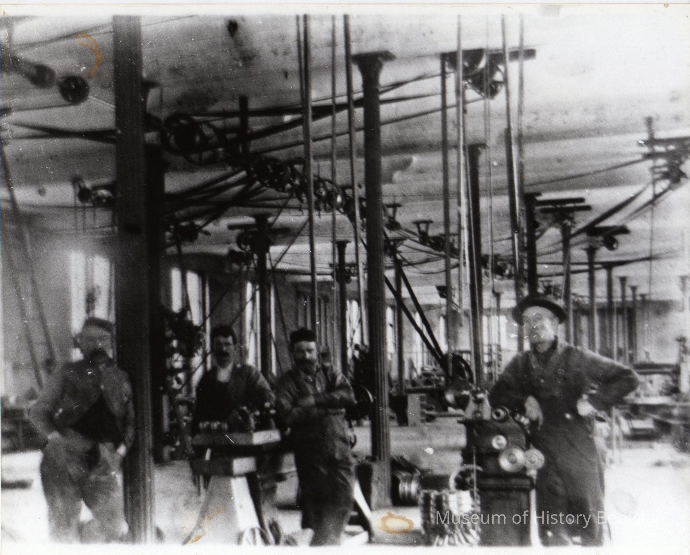 Black and white photo of five men in the Arsenal machine shop. Equipment is powered by a belt and pulley system.