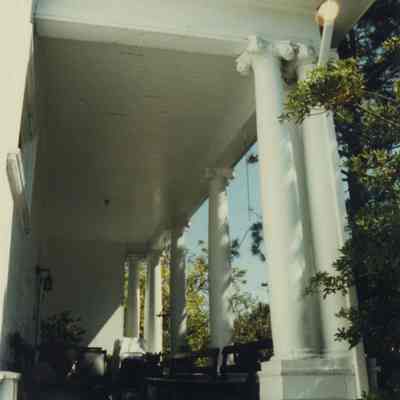 There is a long narrow porch on the east side and the massive roof is supported by Ionic pillars.