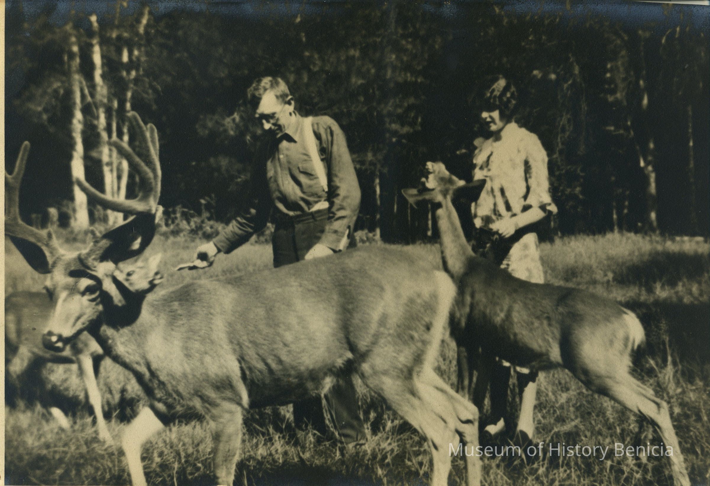 B/W Photograph - Unidentified man and woman in an outdoor/forested area with three deer,