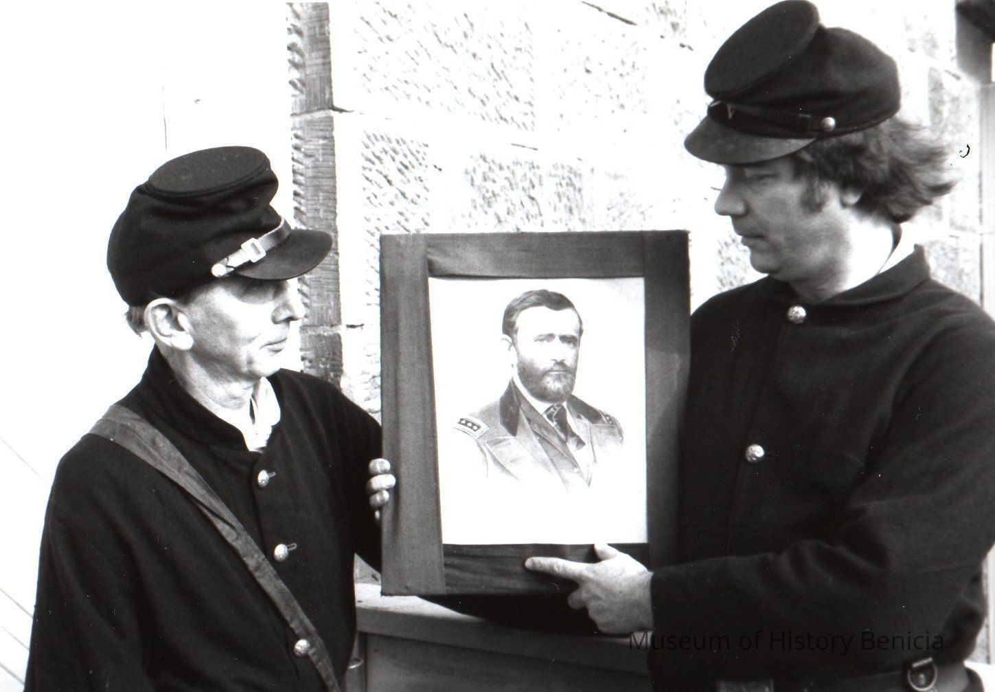 B/W photo: caption on back: Larry Rogers and Dave Stevens looking at a framed lithograph of U.S. Grant used during his campaign for President in 1868 (Stevens is holding the frame);