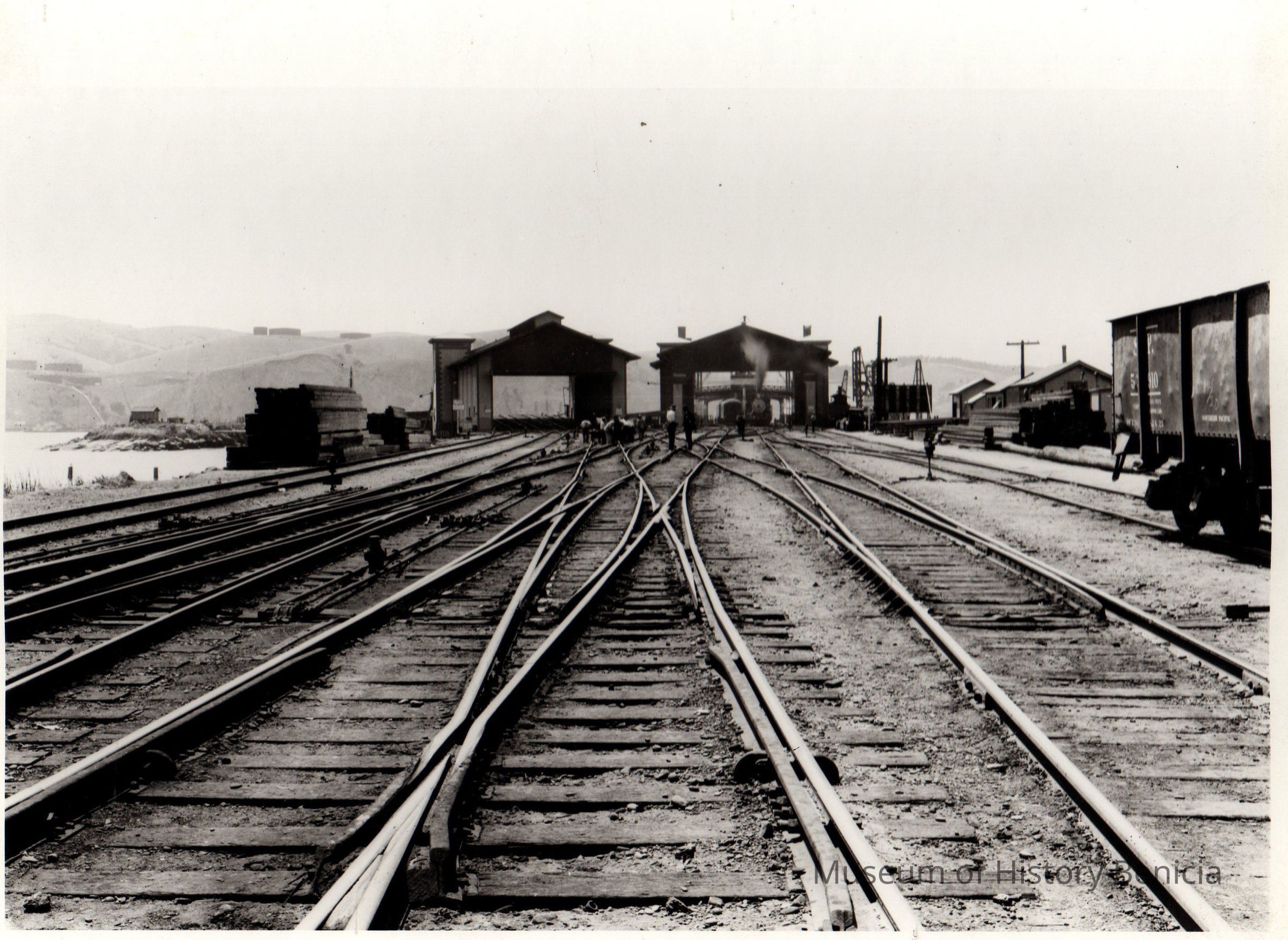 B/W Photograph: Benicia yard view, looking west, about 1923. (information on the back of the photo is incorrect in saying it is looking "east", because the straits are on the left, not on the right as they are when you are looking east.)Collection