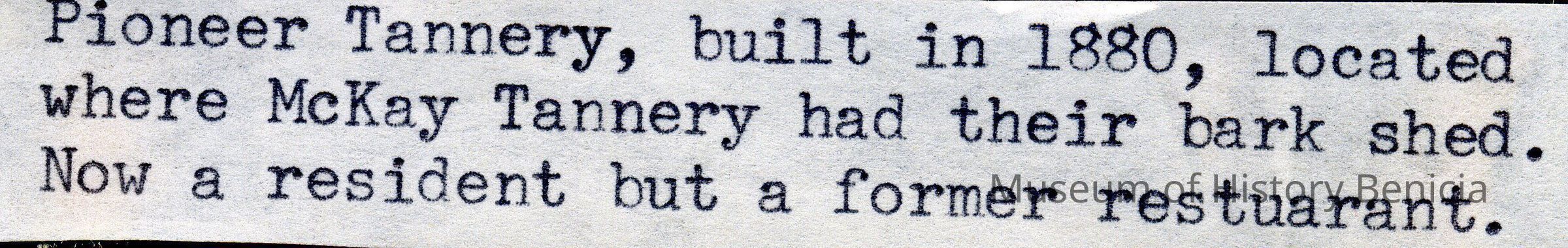 B/W photograph of Pioneer Tannery, built in 1880, located where McKay Tannery had their bark shed (now a resident but a former restaurant).Collection