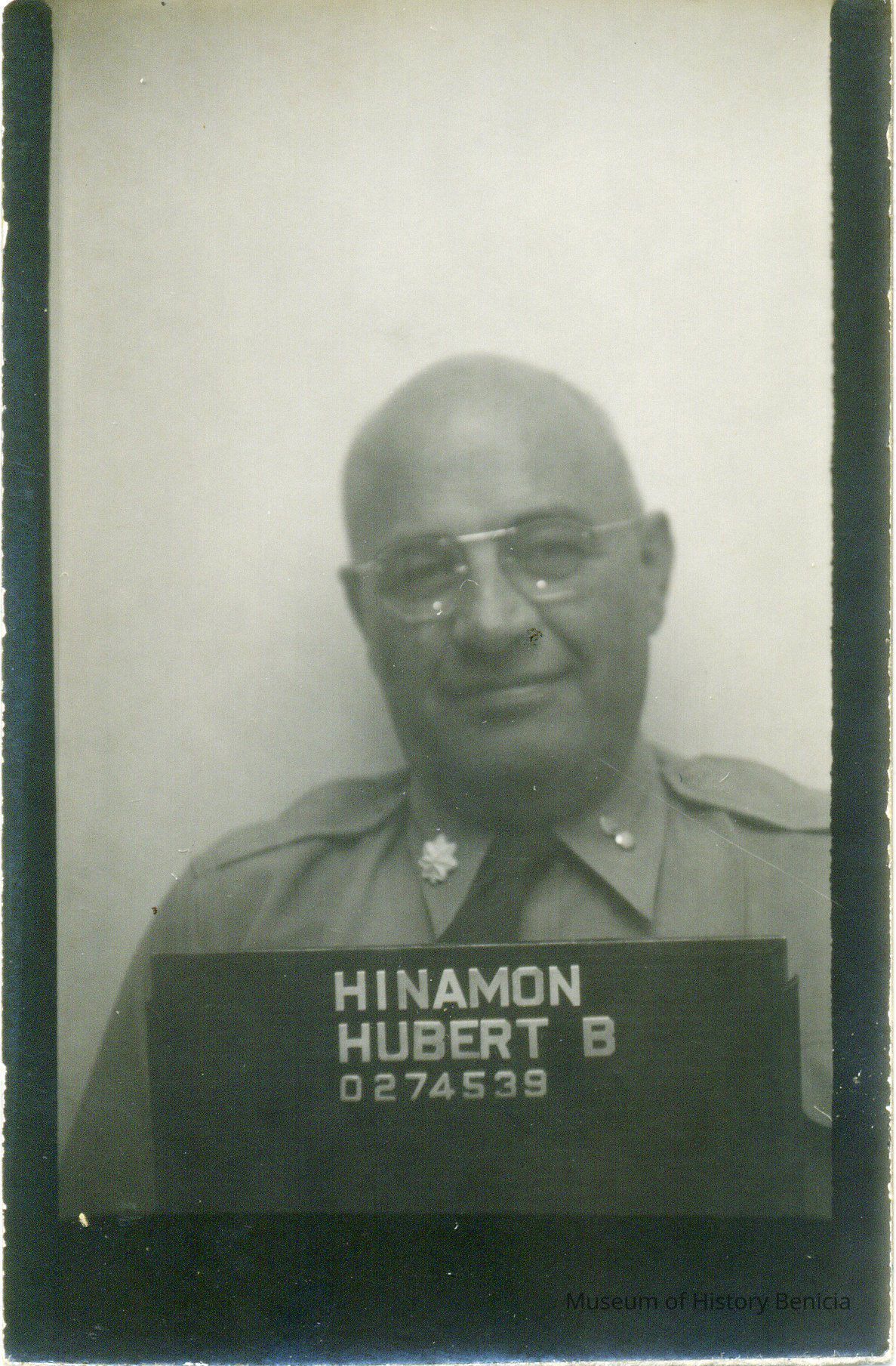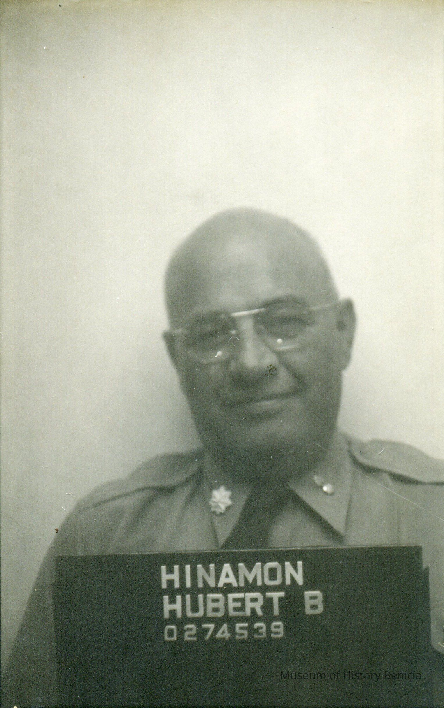 Bust of bald man in uniform and glasses labeled "HINAMON, HUBERT B. / 0274539" in photo. In envelope written "Col. Hinamon / Office of Supply / Bldg. 47 / Security Office." Black and white photo.Collection