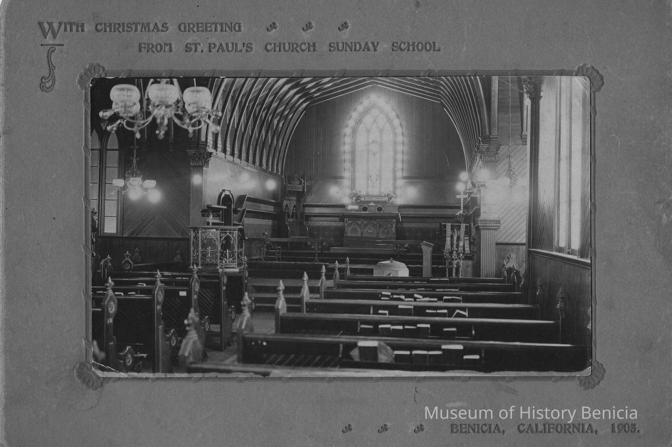 B/W photograph: interior of St. Paul's Episcopal Church. Above the photograph on the mat is cut: "With Christmas Greetings From St. Paul's Church Sunday School" Below the photograph on the mat is cut: "Benicia, California, 1905"Collection