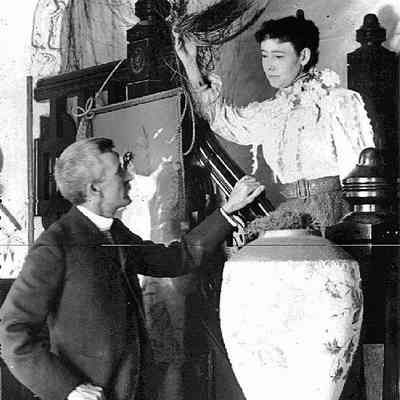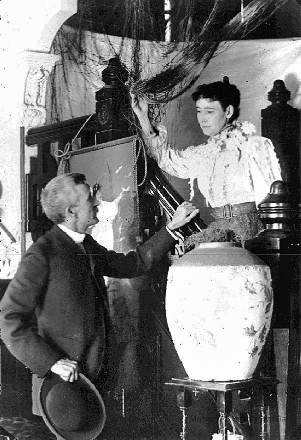 B/W photograph, which appears as Figure 62 in Bruegmann's book, identified in the book as "Franklin and Henrietta Fish in the stair hall of their new house, 1890s (?)".Collection