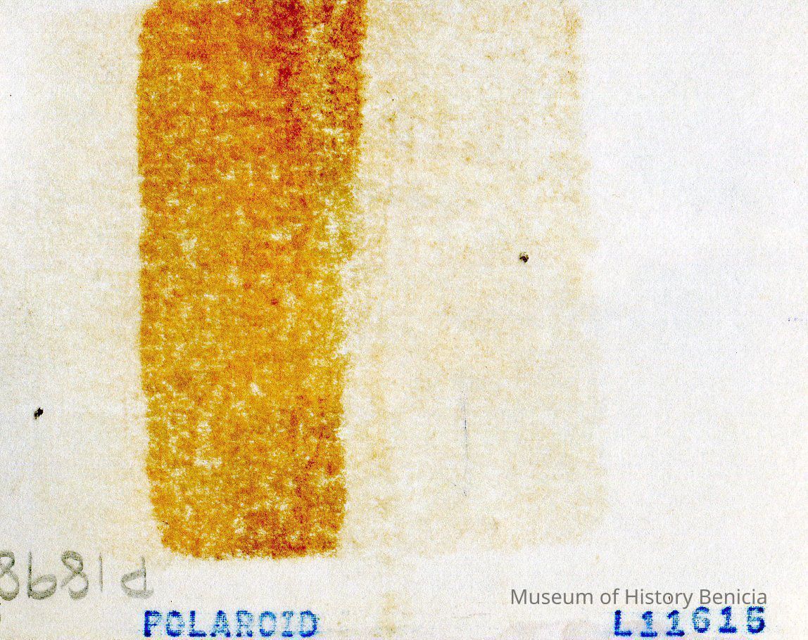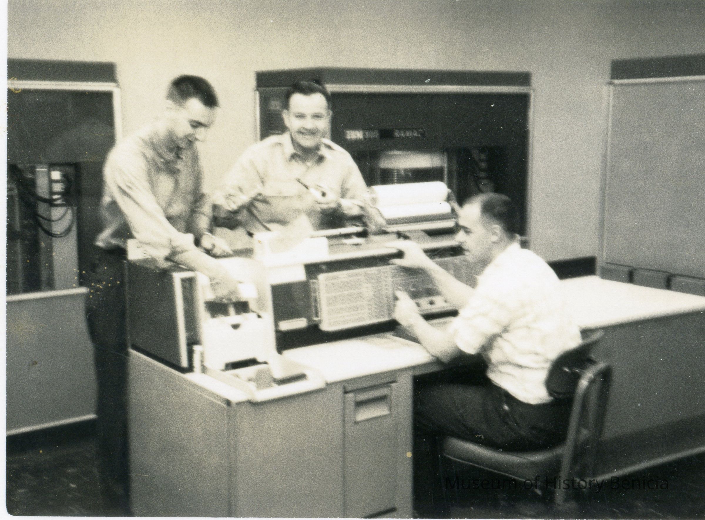 Black and white photo of three men in civilian clothes at a desk with a computer on it. "Polaroid L11615" stamped on back.Collection