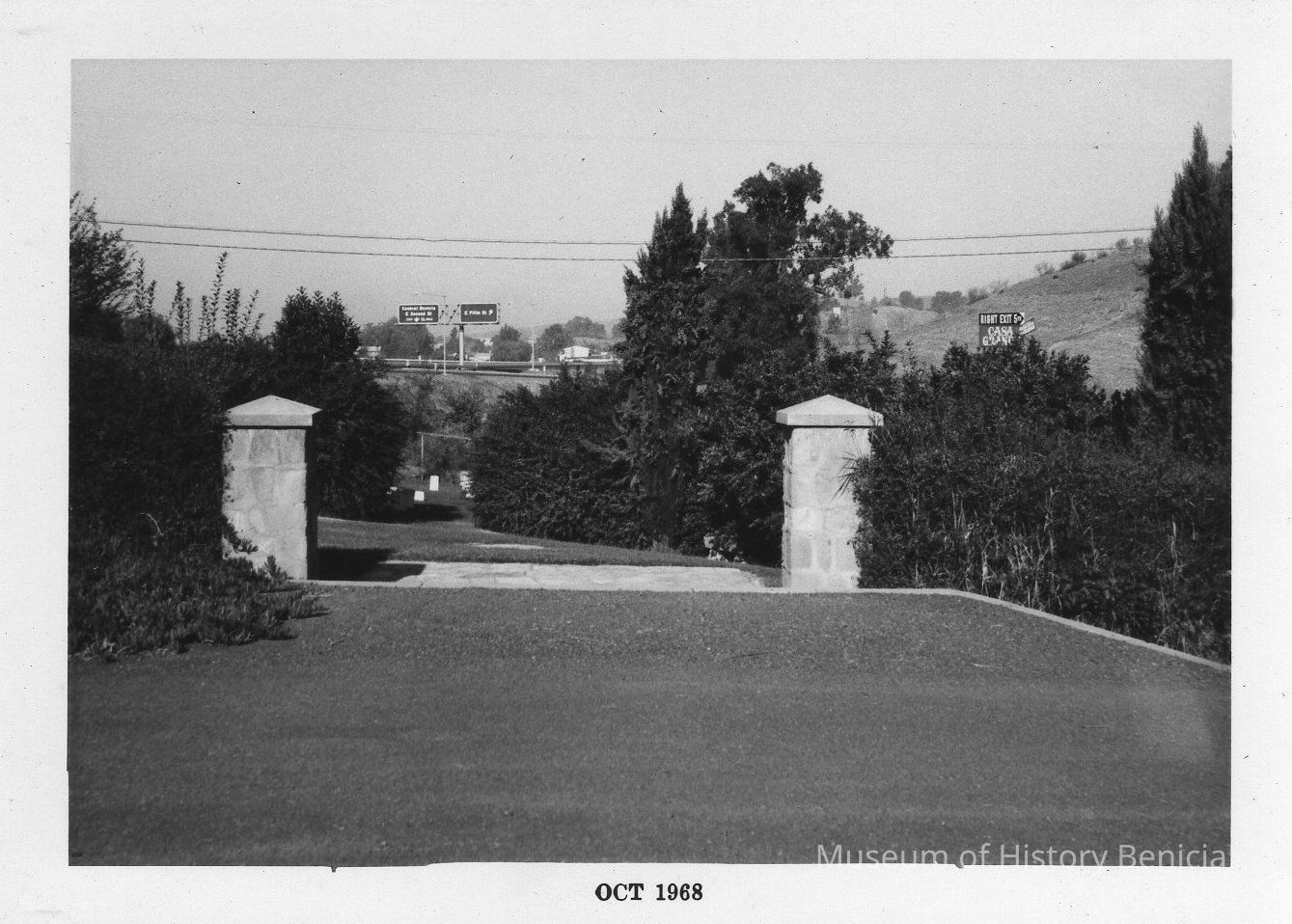 B/W photograph of the Benicia Post Cemetery gates. The Benicia Post Cemetery was established in 1849 as part of the Benicia Barracks. Freeway signs can be seen in the background along with a bill board advertising the new housing in the Casa Grande area off East Fifth StreetCollection