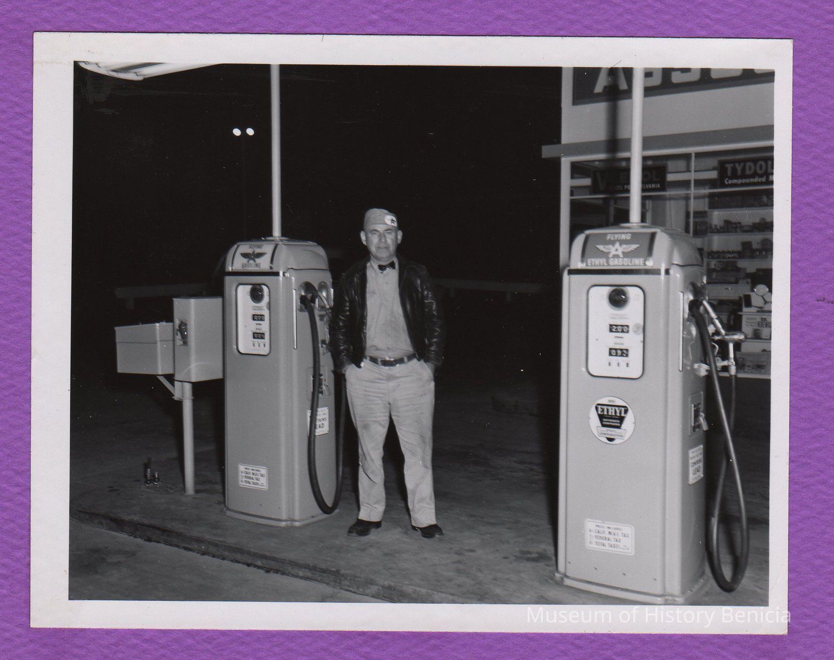 B/W Photograph: per back of photograph: William Davena was Fire Chief in Benicia. He is shown at the "Flying A" service station he later owned at First and East H Streets.
