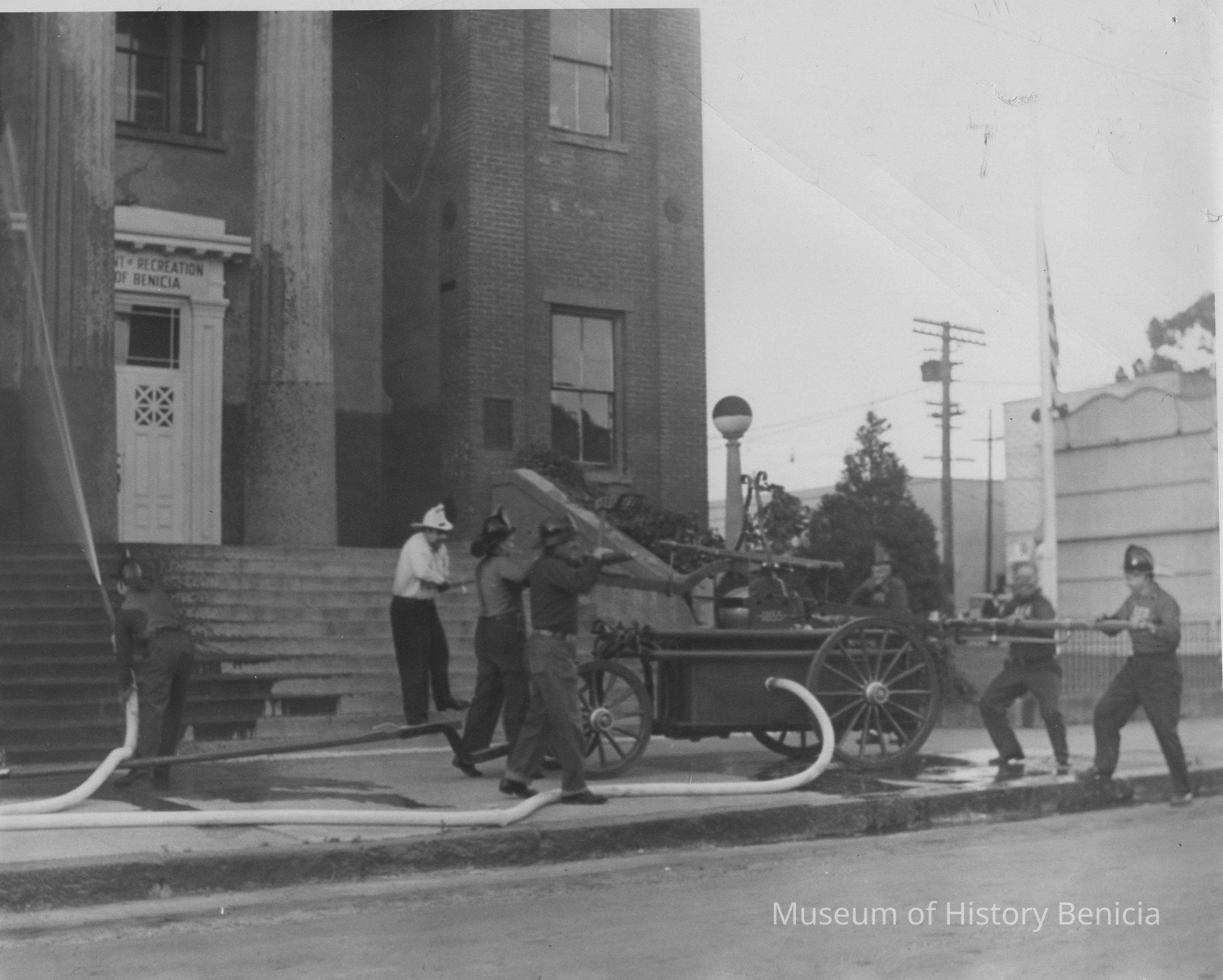 Washing the steps--re-enactment--tradition for Admission Day celebration. Captain in white--Jerry Dana. Solano Engine #1-- 1855 (named after Chief Solano). B/W photo.